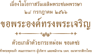 เนื่องในโอกาสวันเฉลิมพระชนมพรรษา ๒๘ กรกฎาคม ๒๕๖๖ ขอพระองค์ทรงพระเจริญ ด้วยเกล้าด้วยกระหม่อม ข้าพระพุทธเจ้า คณะกรรมการ ผู้บริหาร และพนักงาน บมจ. ธนาคารกสิกรไทย เนื่องในโอกาสวันเฉลิมพระชนมพรรษา ๒๘ กรกฎาคม ๒๕๖๖ ขอพระองค์ทรงพระเจริญ ด้วยเกล้าด้วยกระหม่อม ข้าพระพุทธเจ้า คณะกรรมการ ผู้บริหาร และพนักงาน บมจ. ธนาคารกสิกรไทย