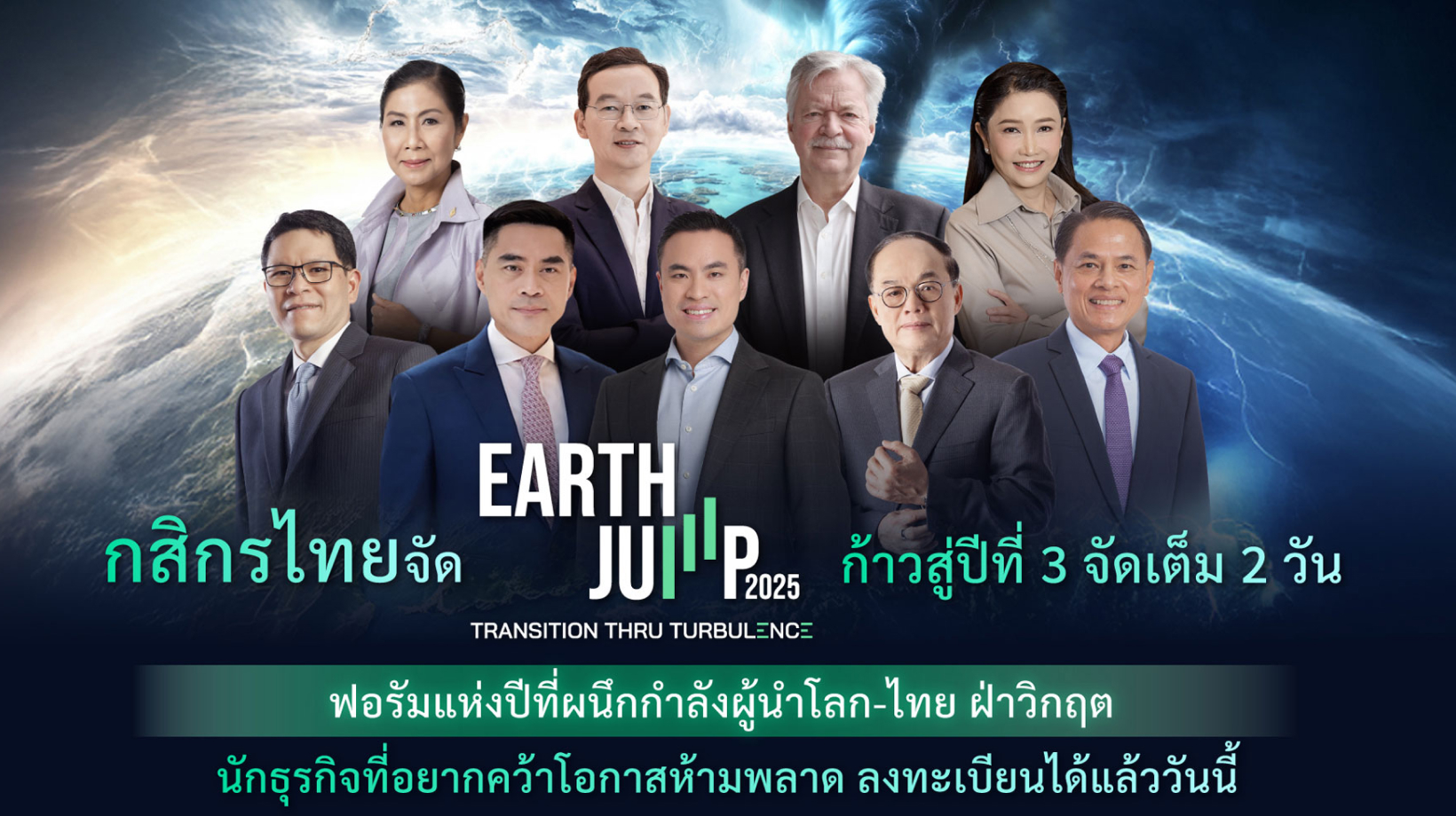 กสิกรไทยจัด EARTH JUMP ก้าวสู่ปีที่ 3 วันที่ 28 - 29 พ.ค. 68 ฟอรัมแห่งปีที่ผนึกกำลังผู้นำระดับโลก-ไทย ฝ่าวิกฤต นักธุรกิจที่อยากคว้าโอกาสห้ามพลาด ลงทะเบียนได้แล้ววันนี้