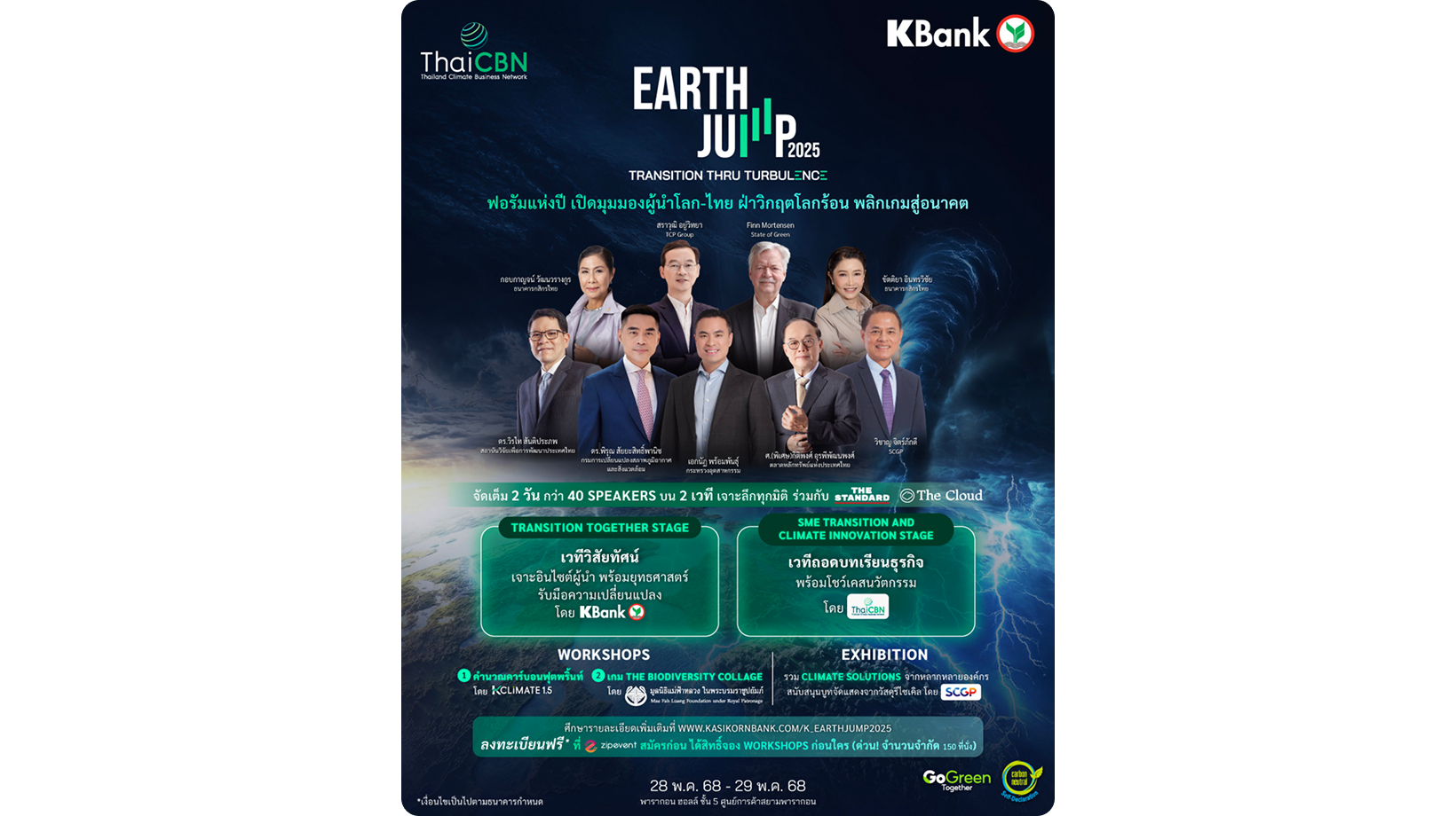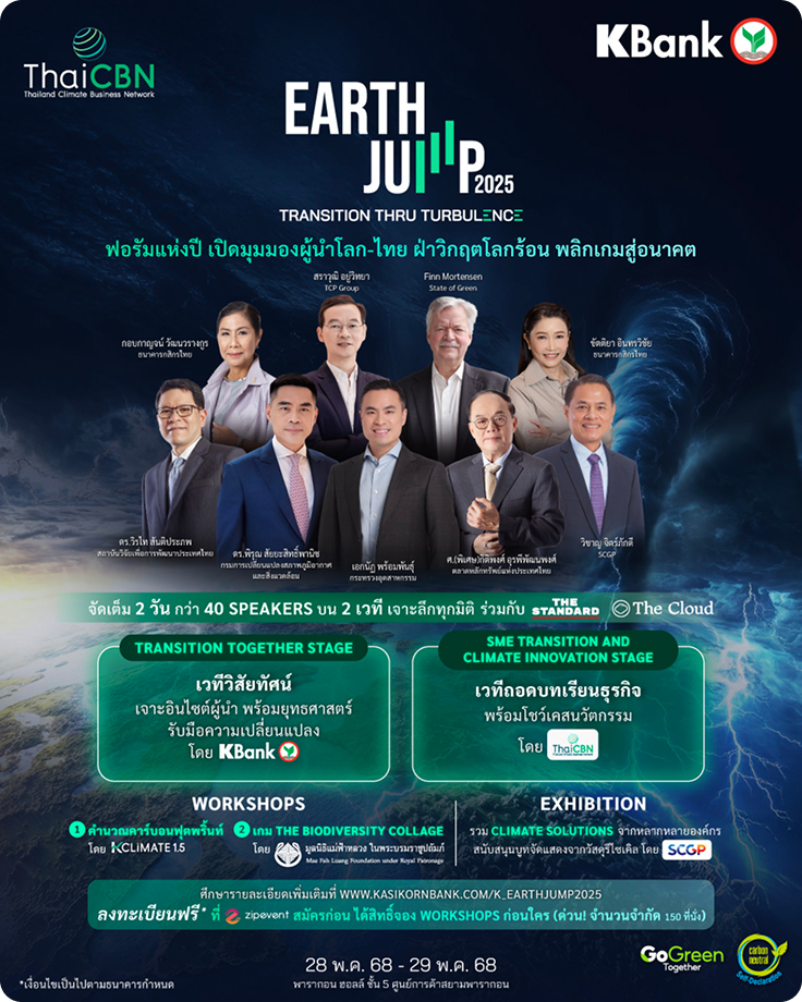 เปิดให้ลงทะเบียนแล้ว EARTH JUMP 2025 ฟอรัมแห่งปีจากธนาคารกสิกรไทย ต่อเนื่องเป็นปีที่ 3 ภายใต้แนวคิด TRANSITION THRU TURBULENCE ผนึกกำลังผู้นำระดับโลกและระดับประเทศร่วมกันพาธุรกิจฝ่าวิกฤต สร้างแต้มต่อในเกมแห่งอนาคตหลังจากงานปีที่แล้วประสบความสำเร็จอย่างล้นหลาม ในปีนี้จึงกลับมาอย่างยิ่งใหญ่กว่าเดิม จัดเต็มสาระความรู้และการนำเสนอนวัตกรรมตลอด 2 วัน กับผู้นำระดับโลกและระดับประเทศกว่า 40 ท่าน บน 2 เวที คือ เวทีเปิดวิสัยทัศน์จากธนาคารกสิกรไทย และเวทีถอดบทเรียนธุรกิจและนวัตกรรมจาก ThaiCBN (Thailand Climate Business Network) นอกจากนี้ยังมี 2 เวิร์กช้อปให้ผู้ร่วมงานไปลองปฏิบัติเพื่อให้เปลี่ยนผ่านสู่ธุรกิจคาร์บอนต่ำได้จริง และมีโซนนิทรรศการ Climate Solutions จากองค์กรชั้นนำ ทำให้งาน EARTH JUMP 2025 ในปีนี้เป็นงานที่พลาดไม่ได้ โดยงานจะจัดขึ้นในวันที่ 28 - 29 พฤษภาคม 2568 เวลา 9.00 – 17.30 น. ณ พารากอน ฮอลล์ ชั้น 5 เปิดให้ลงทะเบียนร่วมงานฟรี!! ตั้งแต่วันนี้ – 27 พฤษภาคม 2568 ที่ Zipevent คลิก! สมัครก่อน ได้สิทธิ์จอง Workshops ก่อนใคร (ด่วน! จำนวนจำกัด) หรือศึกษารายละเอียดเพิ่มเติม