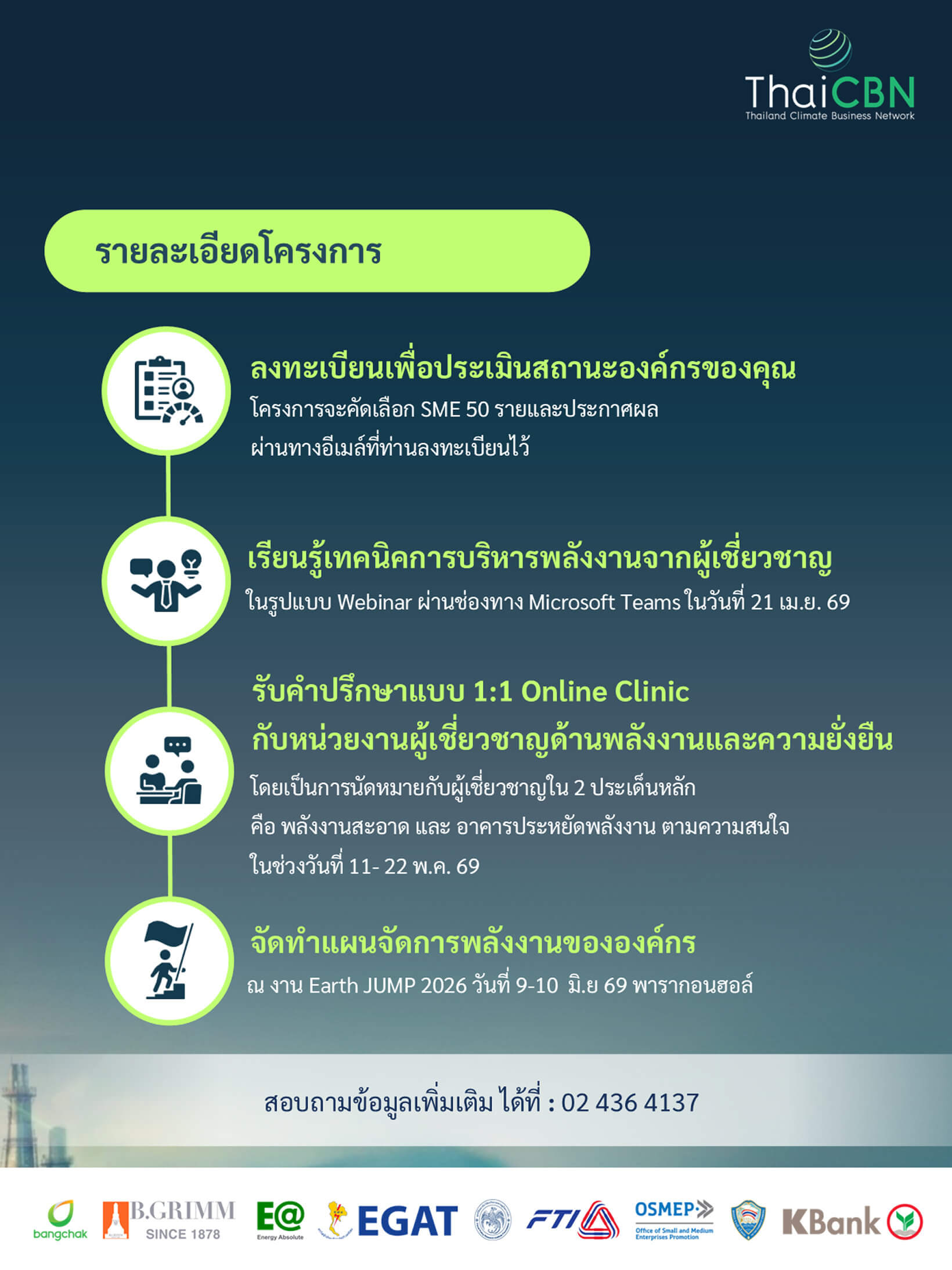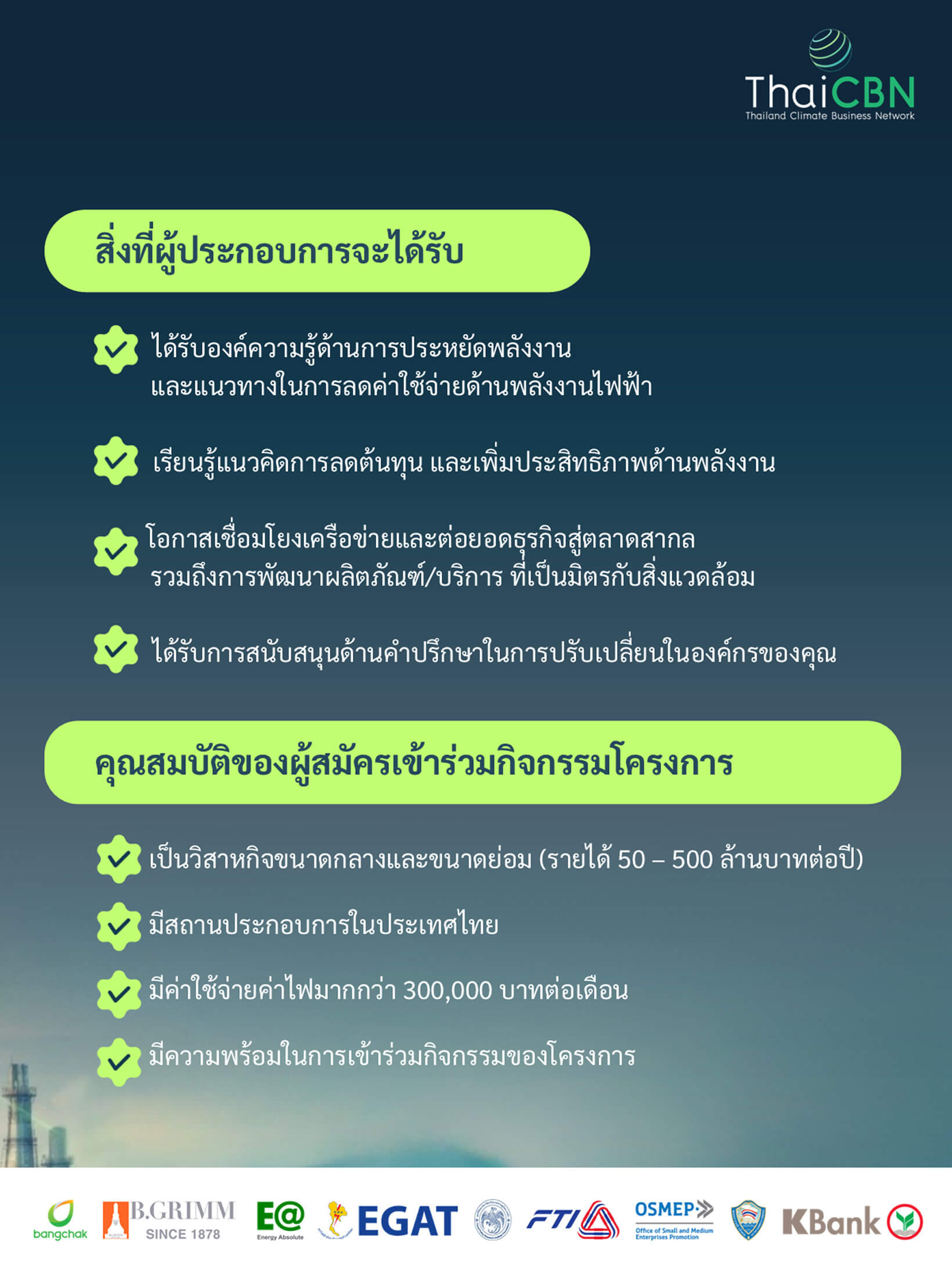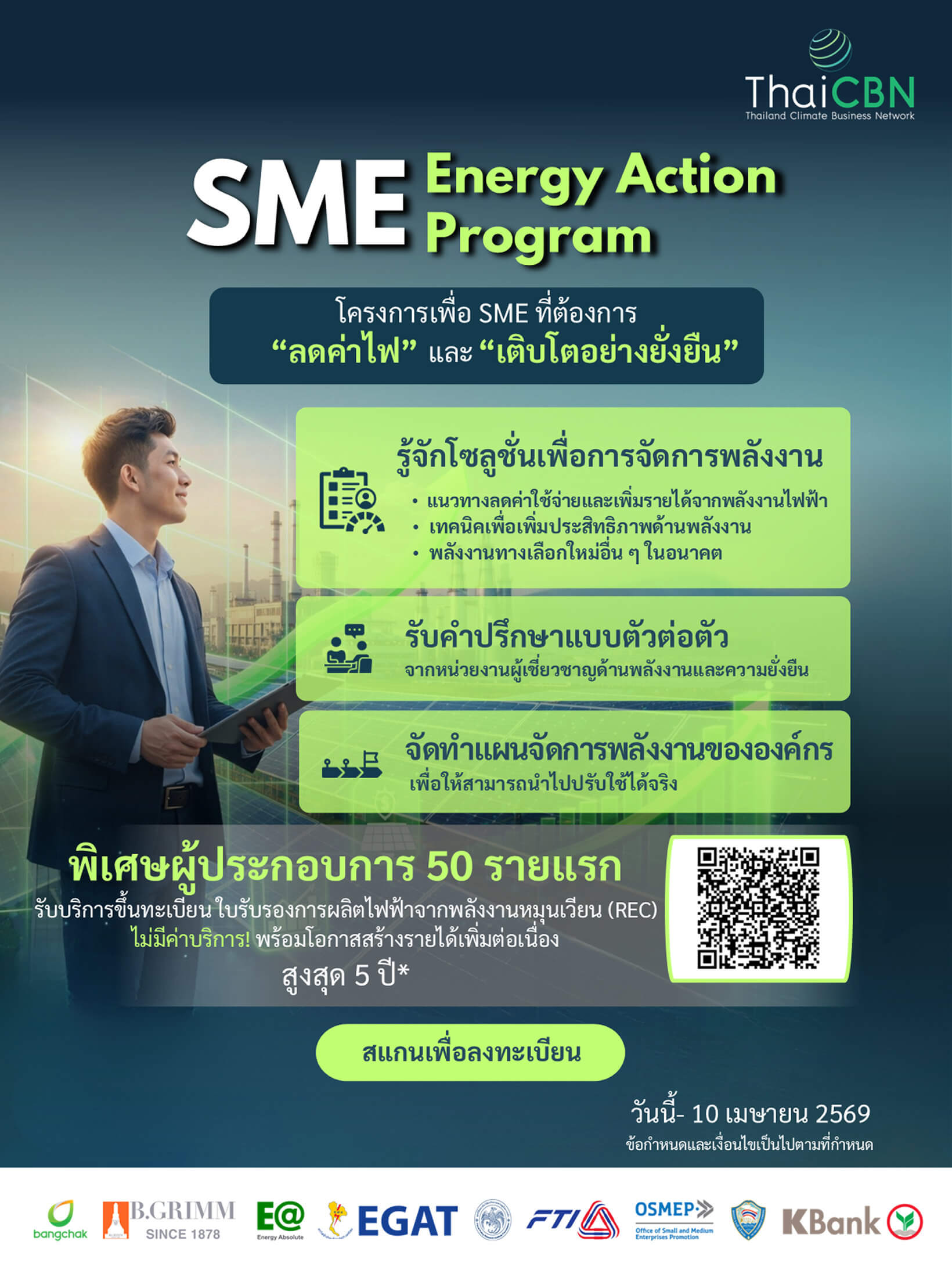 เครือข่ายธุรกิจเพื่อการจัดการสภาพภูมิอากาศประเทศไทย (Thailand Climate Business Network – ThaiCBN) เปิดรับสมัครผู้ประกอบการวิสาหกิจขนาดกลางและขนาดย่อม (SME) เข้าร่วมโครงการ SME Energy Action Program โครงการสนับสนุนผู้ประกอบการในการบริหารจัดการพลังงานอย่างมีประสิทธิภาพ ลดต้นทุนการดำเนินธุรกิจ และเตรียมความพร้อมสู่การใช้พลังงานสะอาดและมาตรฐานด้านความยั่งยืนที่กำลังมีบทบาทสำคัญต่อห่วงโซ่อุปทานในระดับประเทศและระดับสากล