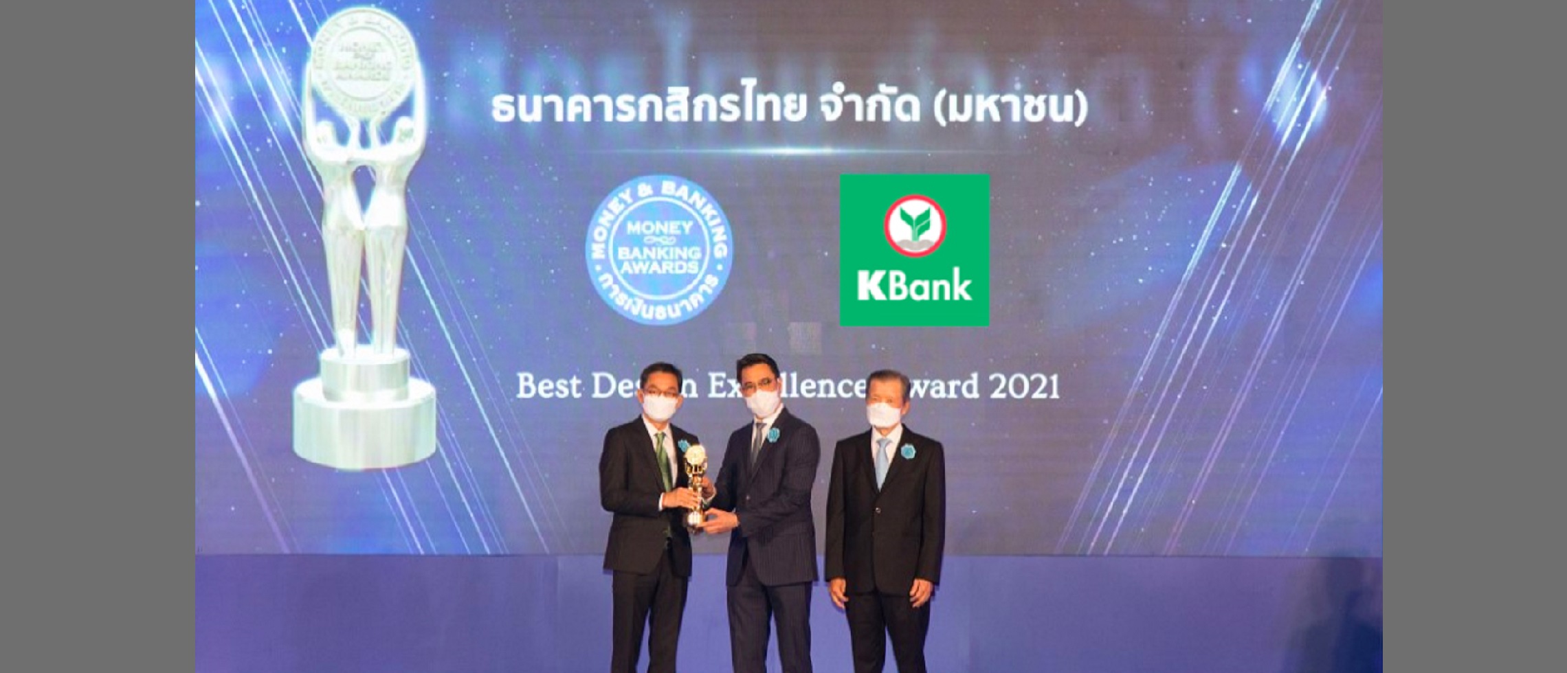 Mr. Pipavat Bhadranavik, KBank Executive Vice President, recently represented the Bank in receiving “Bank of the Year 2021” for SME loan – based on the votes of participants in Money Expo 2021, and “Best Design Excellence Award 2021” for its 850-1,000 sq. m. booth – based on the judgment of dignitaries in attendance. The award ceremony was presided over by Dr. Sethaput Suthiwartnarueput, Bank of Thailand Governor, during the Money & Banking Awards 2021, organized by Money & Banking Magazine at the Portal Ballroom, IMPACT, Muang Thong Thani.
