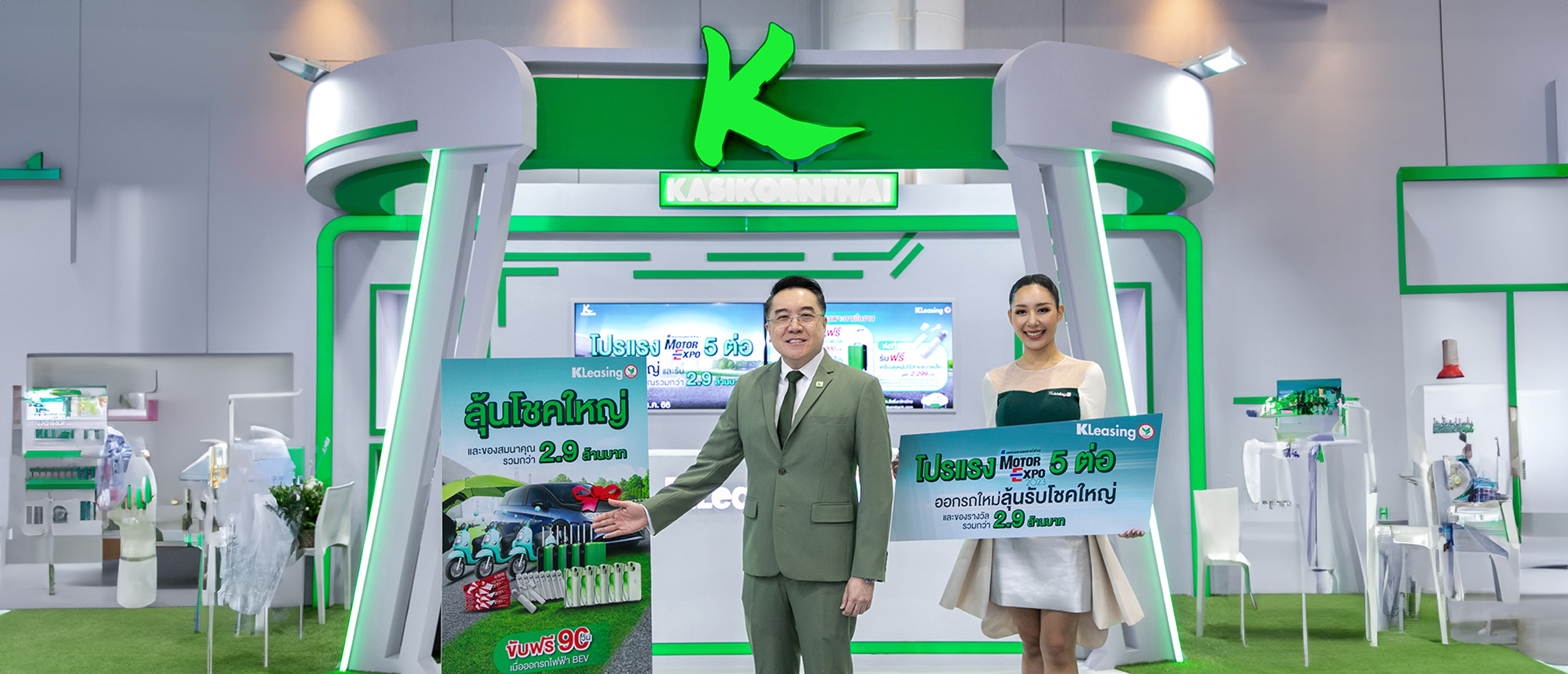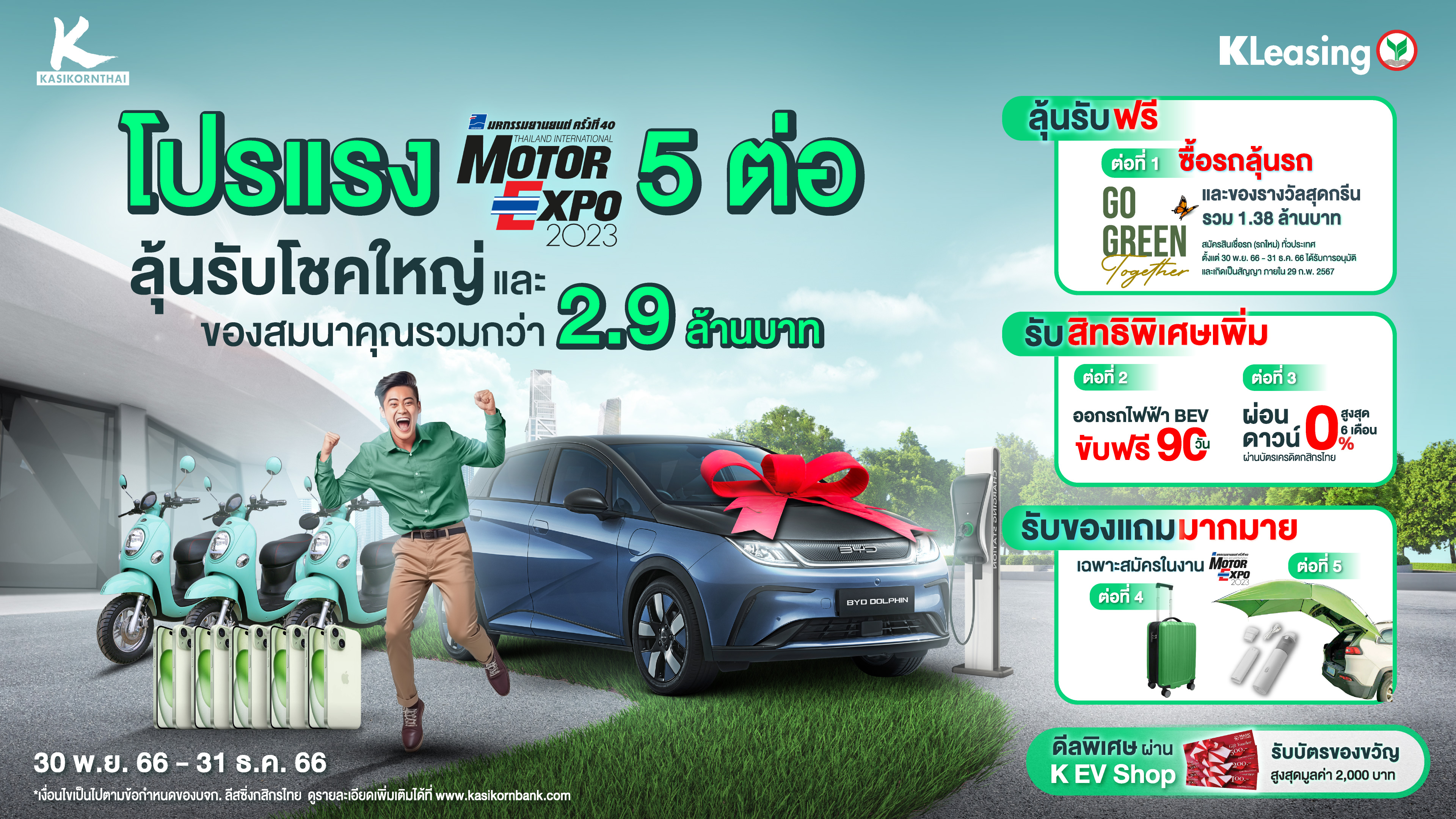 To celebrate the 40th Thailand International Motor Expo 2023, KASIKORN Leasing Co., Ltd. (KLeasing) is launching an amazing year-end campaign to offer five privileges to customers applying for new car loans nationwide. Eligible customers have the chance to win grand prizes, including an electric car, electric motorcycles, and iPhone 15 Plus. A special promotion is offered to KBank Credit Cardholders who are entitled to make an interest-free down payment for up to six months. Customers signing up for a new car loan at KLeasing's booth in the event will receive complimentary gifts such as a foldable travel bag or a car rooftop tent. Additionally, those who buy a car and loan approved within February 2024 will enjoy an extra gift of a car vacuum cleaner. Total value of lucky draw prizes and complimentary gifts amounts to more than 2.9 million Baht. KLeasing will also press ahead with co-promotions jointly launched with its partners across different brands while fostering partnerships with several leading EV brands in alignment with the ESG policy of KASIKORNBANK (KBank).