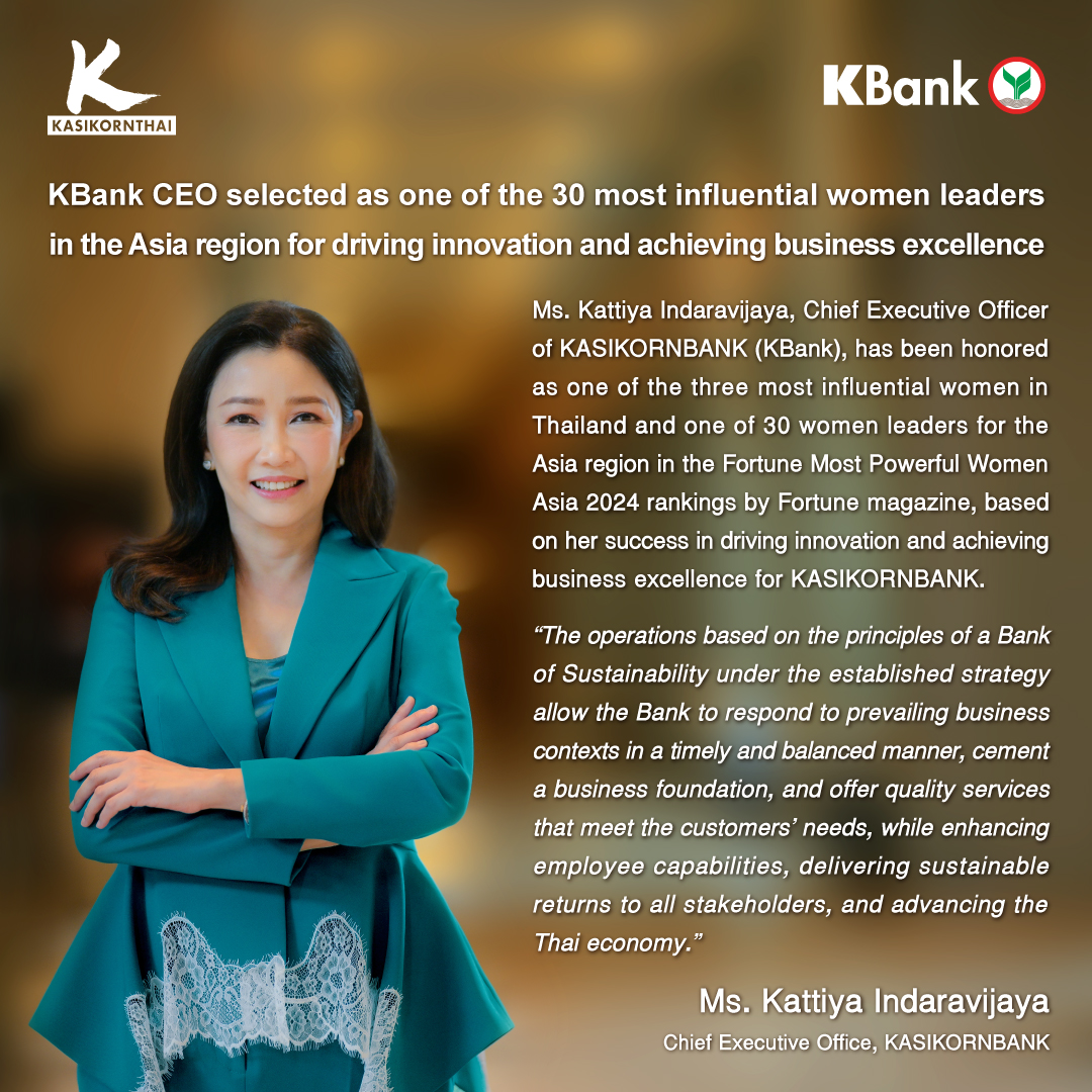 Ms. Kattiya Indaravijaya, Chief Executive Officer of KASIKORNBANK (KBank), has been honored as one of the three most influential women in Thailand and one of 30 women leaders for the Asia region in the Fortune Most Powerful Women Asia 2024 rankings by Fortune magazine, based on her success in driving innovation and achieving business excellence for KASIKORNBANK.