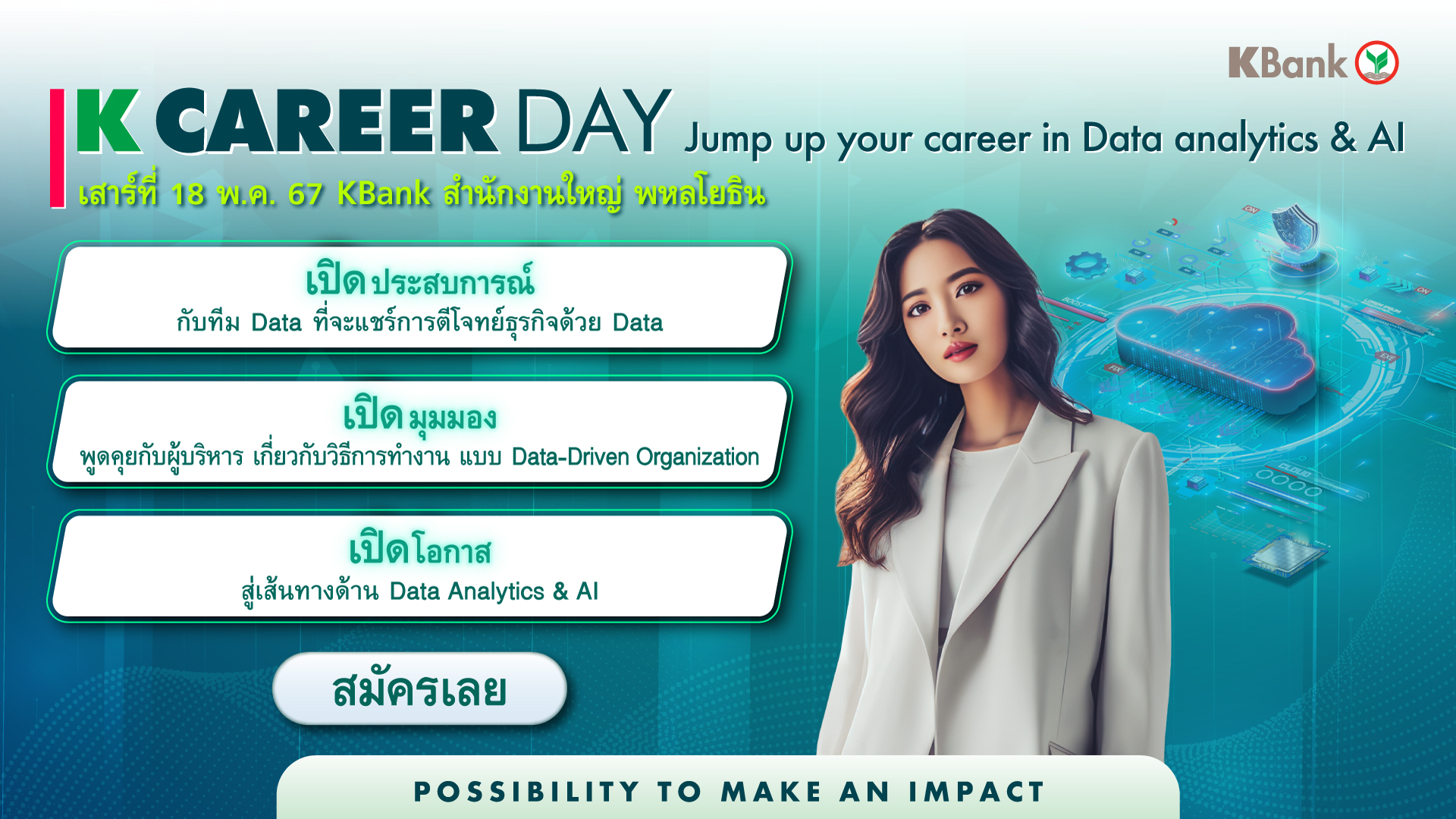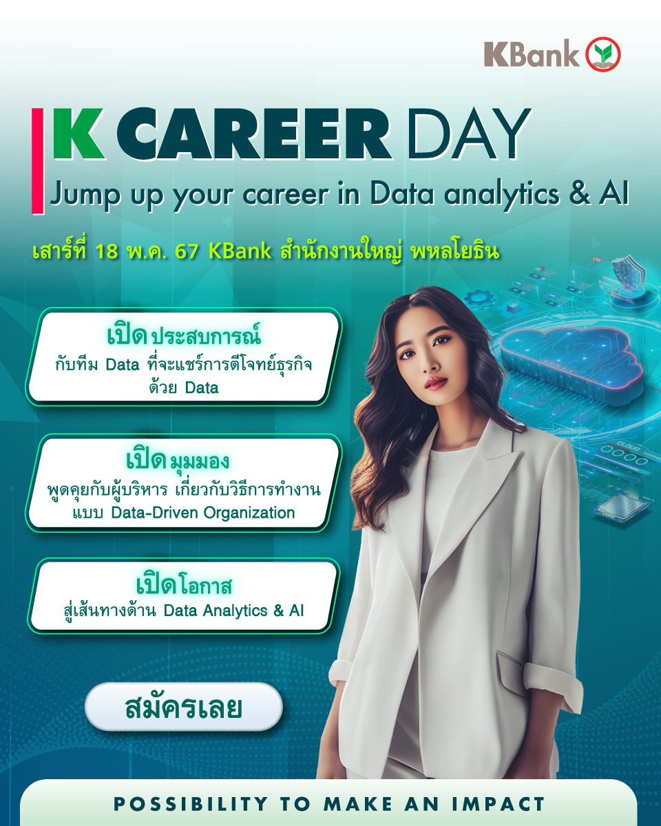 Join us to show the world what you are capable of. KBank offers plenty of opportunities, both in Thailand and abroad, to get hands-on and prove yourself. Plus, you’ll be supported by open-minded teams and leaders who will give you the freedom to learn by doing.