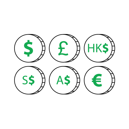 15 Currencies AUD, CNY/RMB, EUR, GBP, HKD, IDR, INR, JPY, KRW, MYR, PHP, SGD, USD, VND, MMK *Supported currencies are subject to change. |
