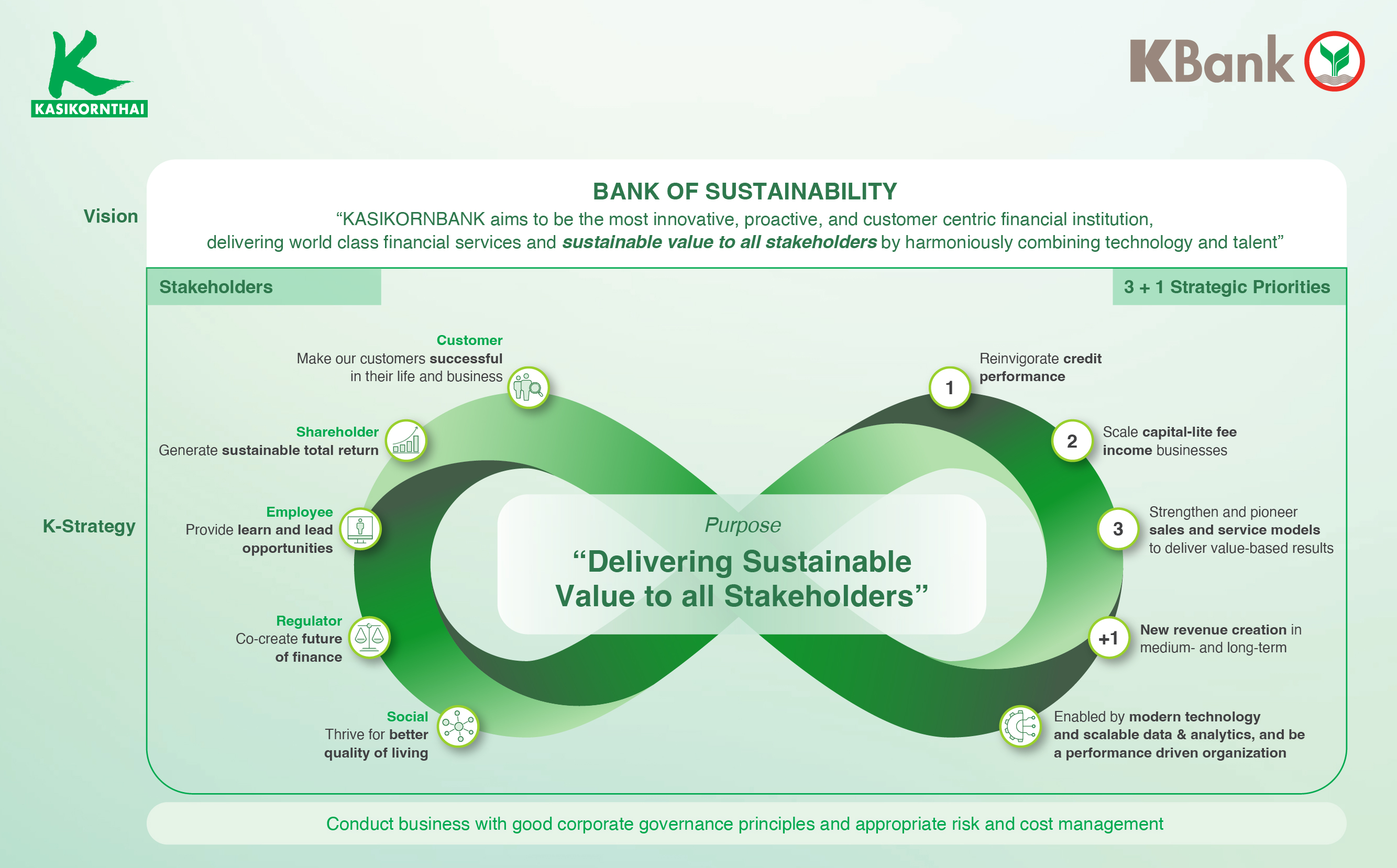 KBank has adopted a 3+1 strategy that is about focusing on three priorities to generate sustainable growth, and an additional mission to generate new income in the medium and long term.