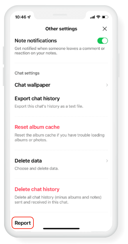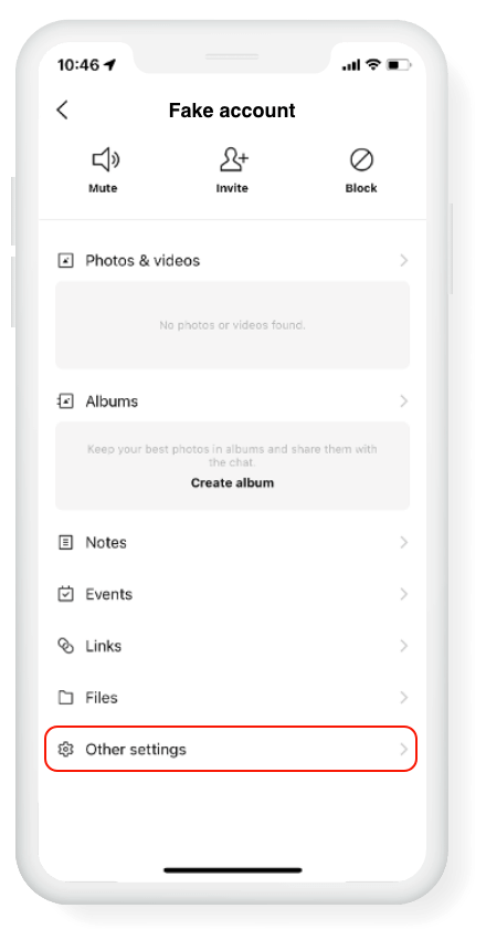 an examination and have the fake account deleted. Go to the Chat menu of the fraudulent user account -> Other settings -> Report.
