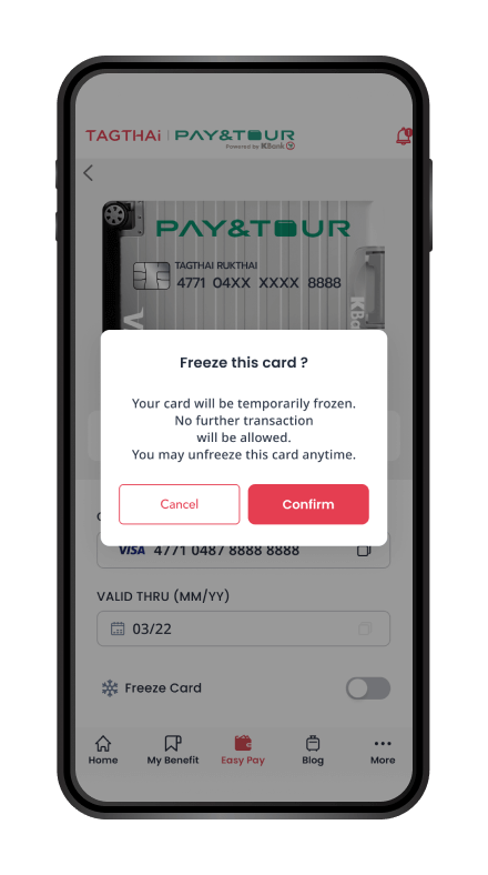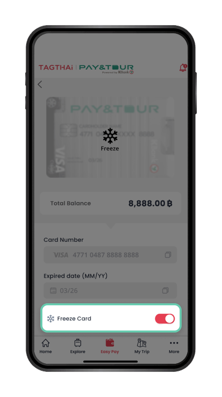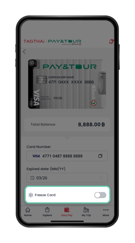 Your security is our priority. You can activate or deactivate the card by yourself. In case of a lost or stolen card, you can immediately suspend your card via TAGTHAi.