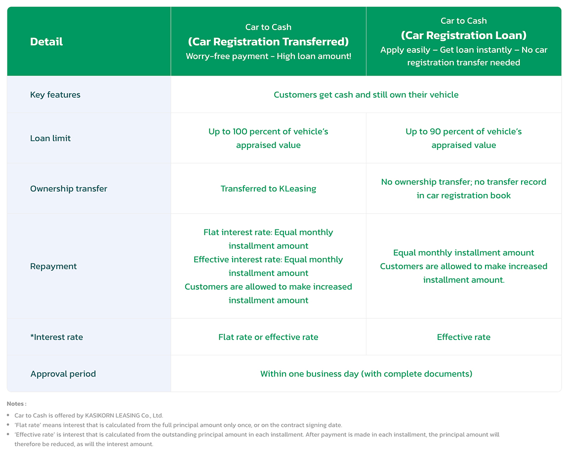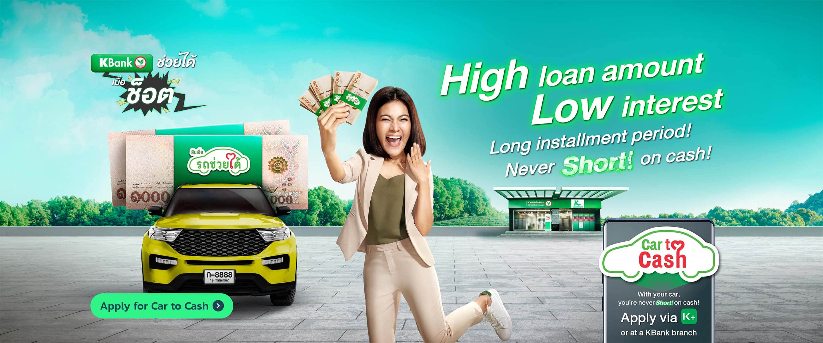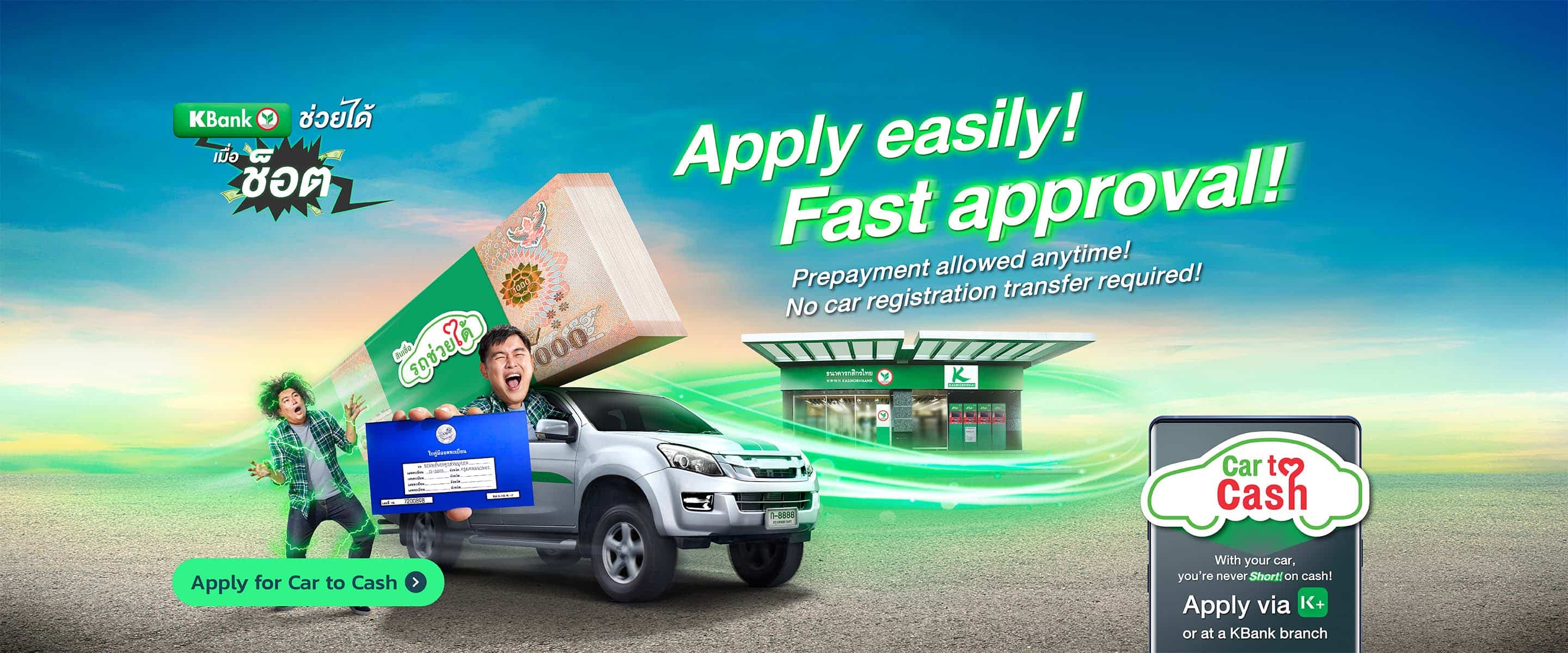 For customers of Car to Cash (car registration transferred), loan is granted at 100 percent of the vehicle’s appraised value. For customers of Car to Cash (car registration loan), loan is granted at 90 percent of the vehicle’s appraised value. For customers of either Car to Cash scheme, approved loan limit starts at a minimum of 100,000 Baht.