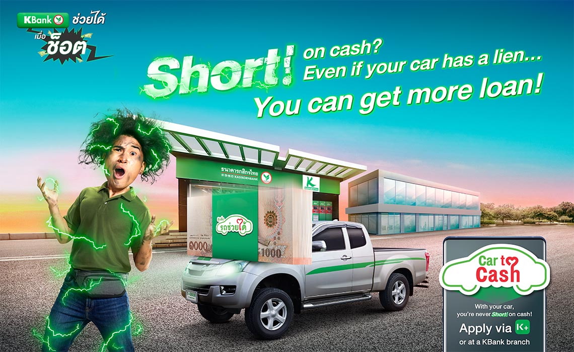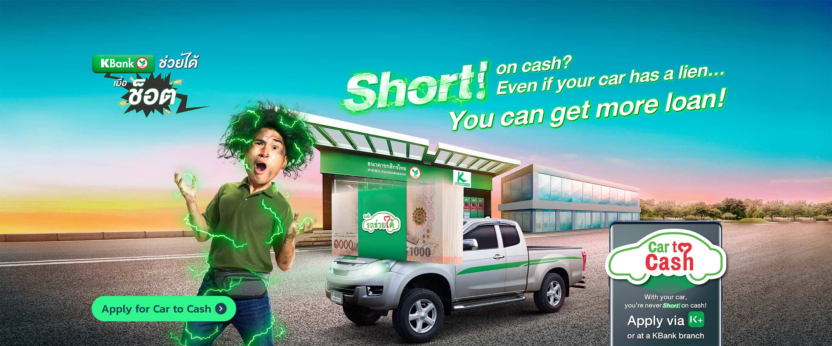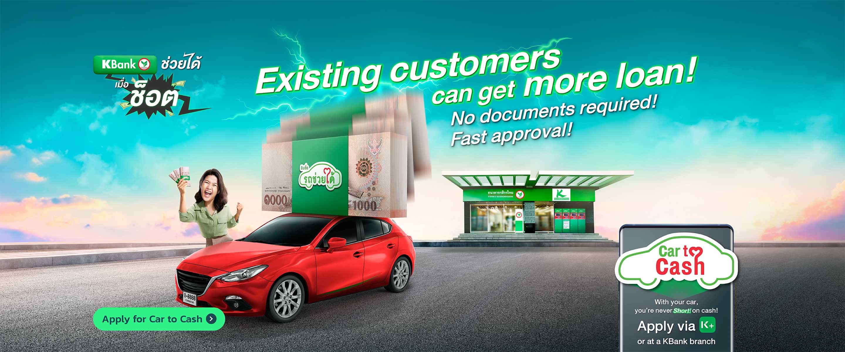 For customers of Car to Cash (car registration transferred), loan is granted at 100 percent of the vehicle’s appraised value. For customers of Car to Cash (car registration loan), loan is granted at 90 percent of the vehicle’s appraised value. For customers of either Car to Cash scheme, approved loan limit starts at a minimum of 100,000 Baht.
