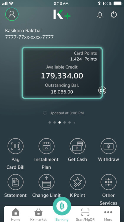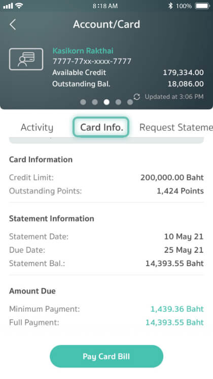 Choose "Card Info.” to view the credit limit, outstanding points, statement date, statement balance, and amount due. Press “Pay card Bill” for either minimum or full payment
