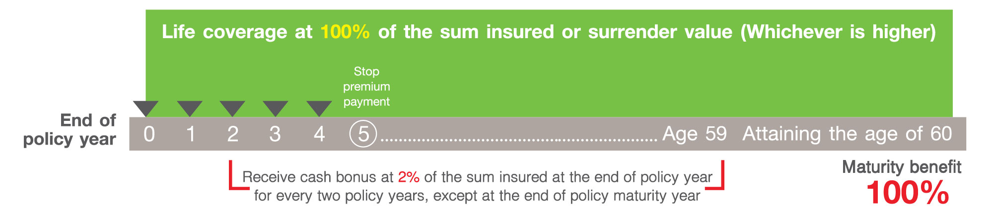 There is 2% cash bonus of the initial sum insured paid every 2 policy years (except the end of the policy maturity year). Upon attaining the age of 60, the insured shall receive 100% maturity benefit of the initial sum insured.