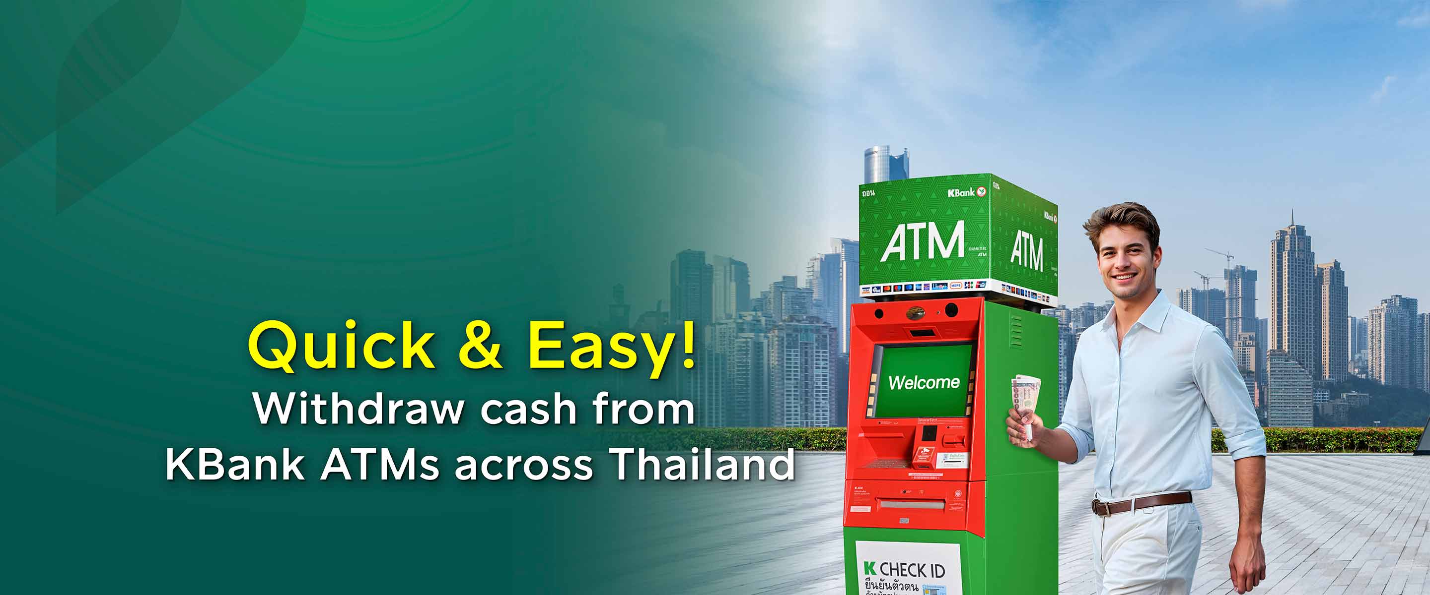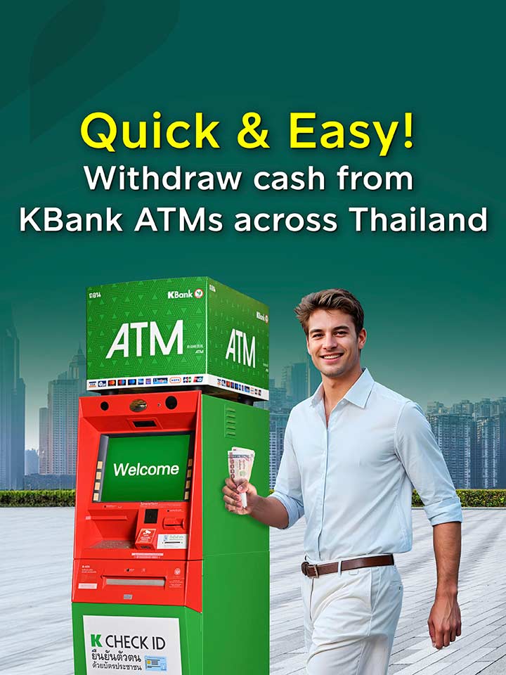 KBank offers convenient and secure ATM services. With more than 10,000 KBank ATMs nationwide available 24/7,