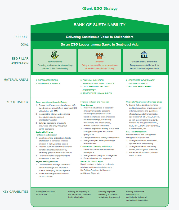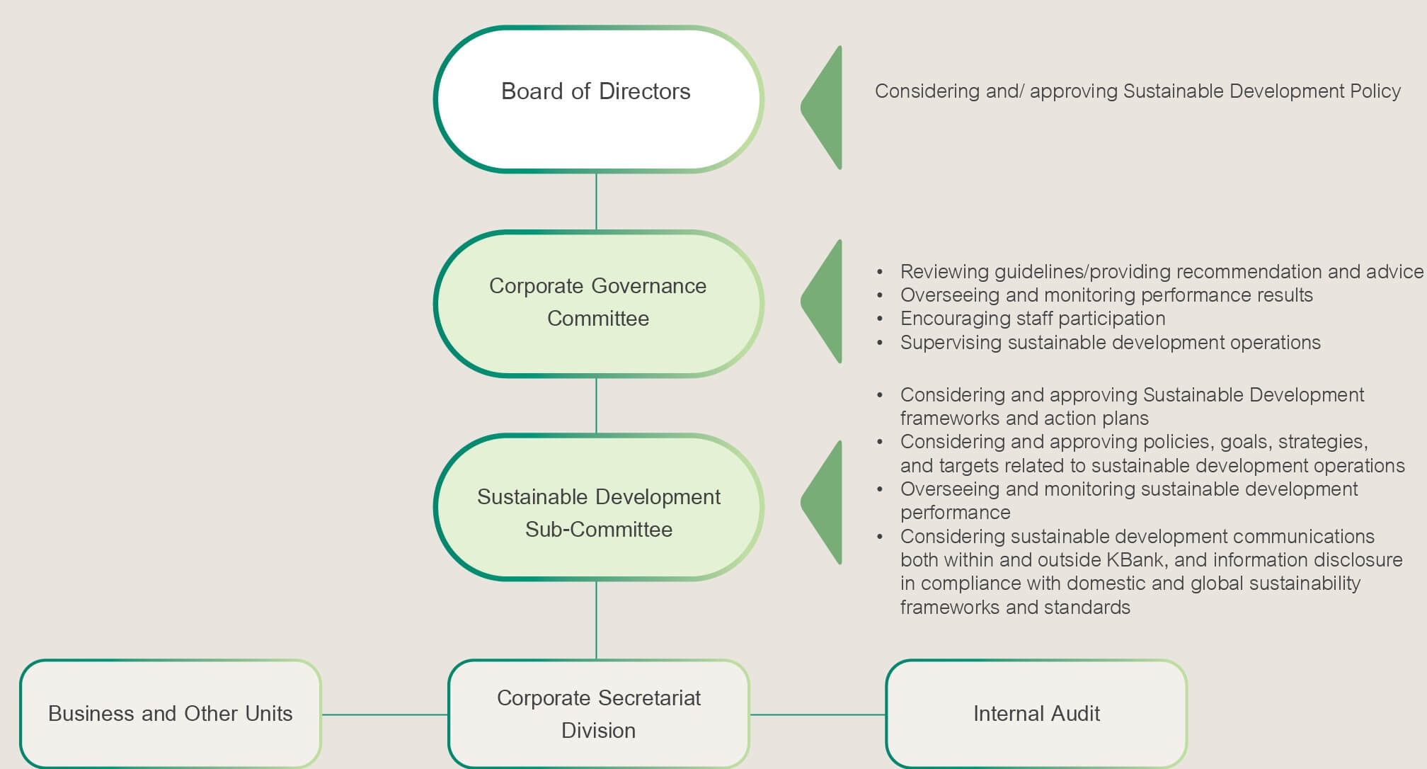 KBank has assigned the Corporate Governance Committee to supervise sustainable development operations; the Committee holds at least four meetings a year to determine operational guidelines, monitor and report to the Board of Directors.
