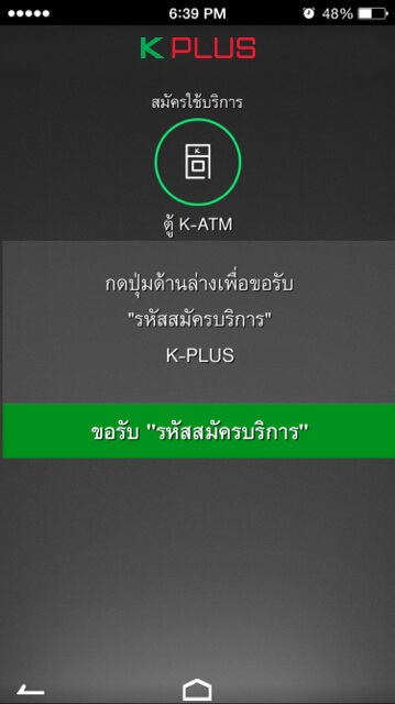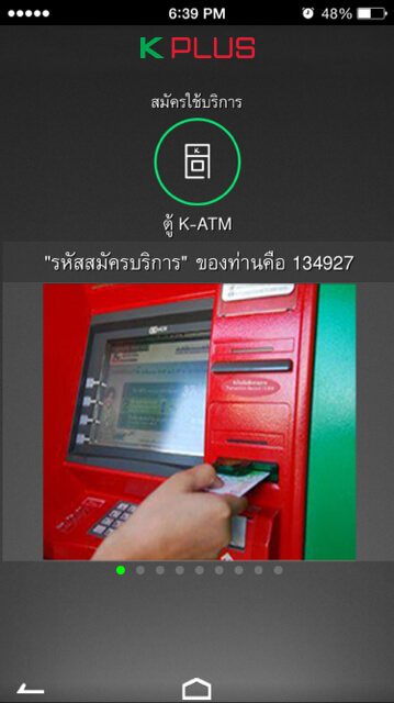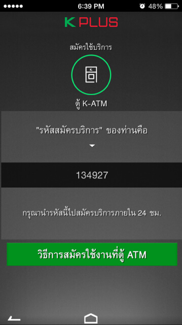 4 หน้าจอจะแสดงรหัสบริการ (6 หลัก) เพื่อให้นำไปสมัครบริการที่ตู้ ATM ภายใน 24 ชั่วโมง โดยสามารถกดปุ่ม “วิธีการสมัครใช้งานที่ตู้ ATM” เพื่อดูวิธีการสมัครได้