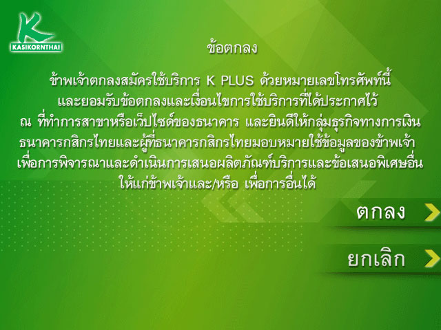 14 ระบบจะแสดงหน้าจอเงื่อนไขและข้อตกลงการสมัครบริการ ให้กด “ตกลง”