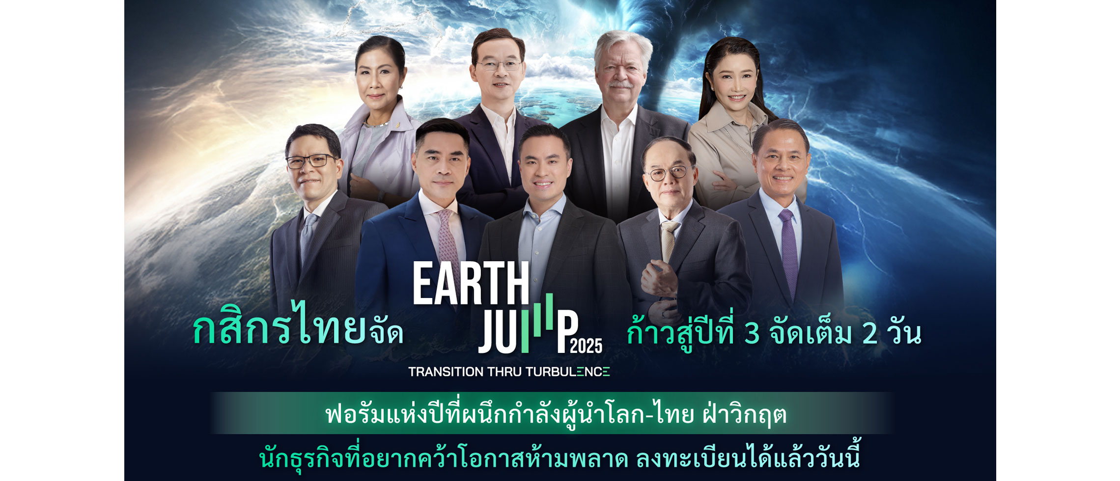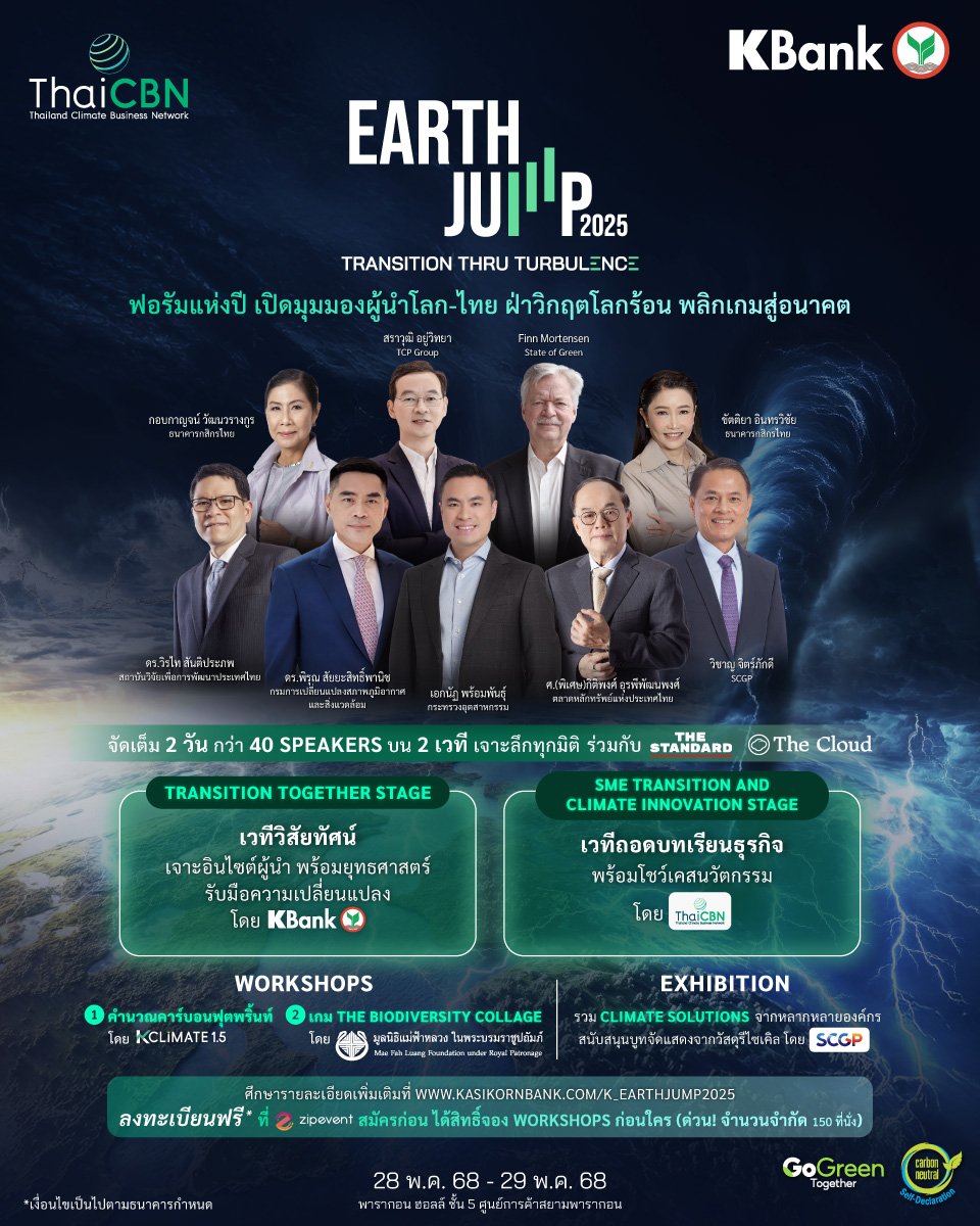 เปิดให้ลงทะเบียนแล้ว EARTH JUMP 2025 ฟอรัมแห่งปีจากธนาคารกสิกรไทย ต่อเนื่องเป็นปีที่ 3 ภายใต้แนวคิด TRANSITION THRU TURBULENCE ผนึกกำลังผู้นำระดับโลกและระดับประเทศร่วมกันพาธุรกิจฝ่าวิกฤต สร้างแต้มต่อในเกมแห่งอนาคตหลังจากงานปีที่แล้วประสบความสำเร็จอย่างล้นหลาม ในปีนี้จึงกลับมาอย่างยิ่งใหญ่กว่าเดิม จัดเต็มสาระความรู้และการนำเสนอนวัตกรรมตลอด 2 วัน กับผู้นำระดับโลกและระดับประเทศกว่า 40 ท่าน บน 2 เวที คือ เวทีเปิดวิสัยทัศน์จากธนาคารกสิกรไทย และเวทีถอดบทเรียนธุรกิจและนวัตกรรมจาก ThaiCBN (Thailand Climate Business Network) นอกจากนี้ยังมี 2 เวิร์กช้อปให้ผู้ร่วมงานไปลองปฏิบัติเพื่อให้เปลี่ยนผ่านสู่ธุรกิจคาร์บอนต่ำได้จริง และมีโซนนิทรรศการ Climate Solutions จากองค์กรชั้นนำ ทำให้งาน EARTH JUMP 2025 ในปีนี้เป็นงานที่พลาดไม่ได้ โดยงานจะจัดขึ้นในวันที่ 28 - 29 พฤษภาคม 2568 เวลา 9.00 – 17.30 น. ณ พารากอน ฮอลล์ ชั้น 5 เปิดให้ลงทะเบียนร่วมงานฟรี!! ตั้งแต่วันนี้ – 27 พฤษภาคม 2568 ที่ Zipevent คลิก!