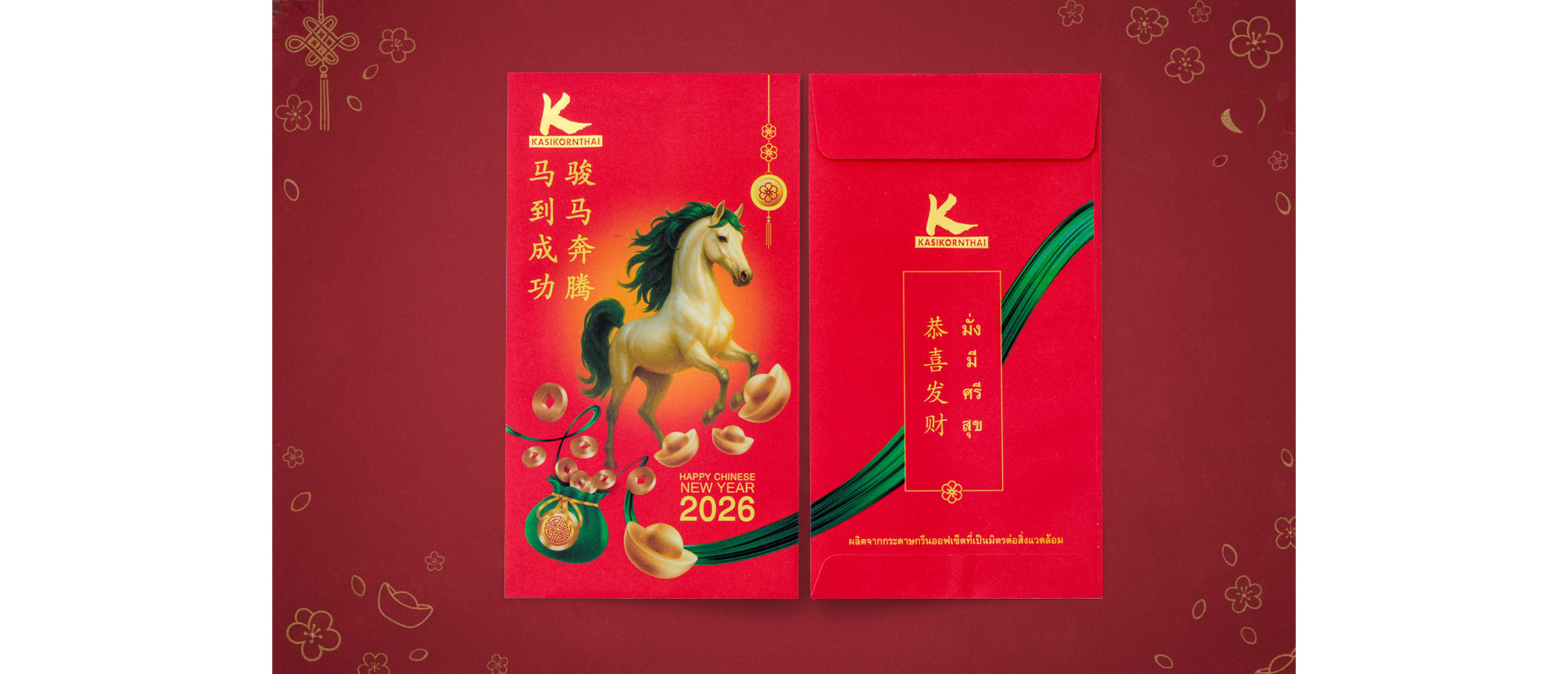 ​​       ธนาคารกสิกรไทย ร่วมฉลองตรุษจีน 2569 ปี “มะเมีย” จัดทำซองอั่งเปา “มั่ง มี ศรี สุข” รูปม้าสีทอง ที่เปี่ยมด้วยพลังแห่งความหวัง เฟื่องฟู สวยงามและอ่อนโยน เสริมความเป็นมงคลให้ผู้รับก้าวเข้าสู่ปีใหม่แห่งความมั่งคั่งด้วยหัวใจที่เบิกบานและสง่างาม ดุจม้ามงคลที่กำลังเริ่มต้นวิ่งสู่วันข้างหน้า เป็นซองที่ผลิตจากกระดาษกรีนออฟเซ็ตที่เป็นมิตรต่อสิ่งแวดล้อม จำนวน 2,500,000 ซอง เพื่อมอบให้แก่ลูกค้าสำหรับใส่ธนบัตรแจกจ่ายในช่วงเทศกาลตรุษจีน สามารถติดต่อรับได้ที่ธนาคารกสิกรไทยทุกสาขาทั่วประเทศ ตั้งแต่วันนี้เป็นต้นไป