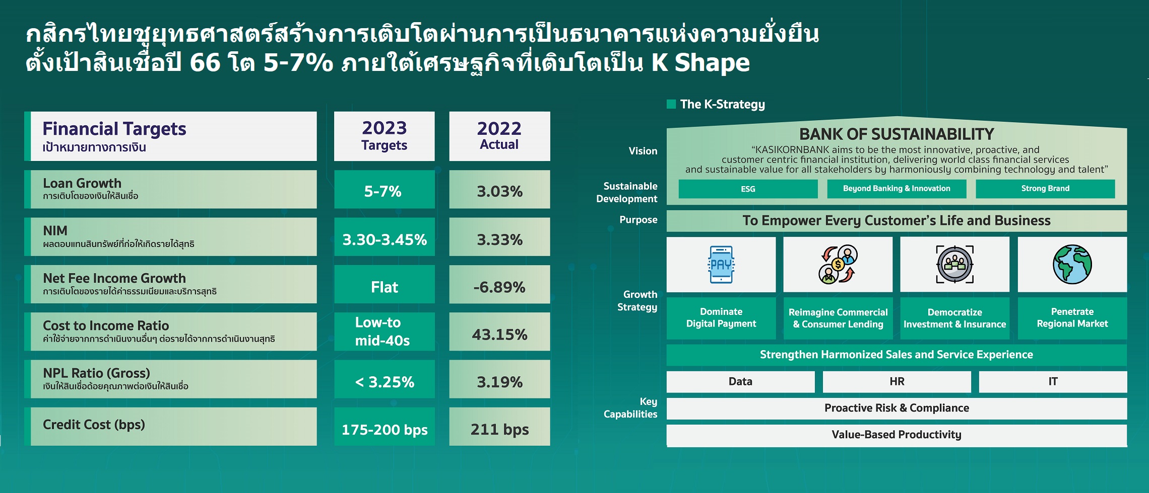 กสิกรไทยยังคงดำเนินยุทธศาสตร์บนหลักการธนาคารแห่งความยั่งยืน ต่อยอดยุทธศาสตร์เพื่อการเติบโตทางธุรกิจและตอบโจทย์ลูกค้า ผ่านการพัฒนาบริการบนดิจิทัล การยกระดับการปล่อยสินเชื่อ การขยายการให้บริการลงทุนและประกัน และการขยายตลาดใน AEC+3 ควบคู่กับการเพิ่มประสบการณ์ที่ดีให้กับลูกค้าผ่านทุกช่องทาง และการยกระดับความสามารถในการแข่งขันในระยะยาวอย่างต่อเนื่อง เพื่อรักษาความมั่นคงในฐานะสถาบันการเงินชั้นนำ สามารถรับมือกับความผันผวนของภาวะเศรษฐกิจที่อาจจะเกิดขึ้นได้อย่างทันท่วงที ตลอดจนนำพาสังคมและเศรษฐกิจไทยเติบโตอย่างยั่งยืน โดยตั้งเป้าหมายทางการเงินปี 2566 สินเชื่อโต 5-7% และควบคุมคุณภาพสินทรัพย์ให้ NPL Ratio อยู่ต่ำกว่า 3.25% อีกทั้งยังคงดำเนินการเชิงรุกในการดูแล และให้ความช่วยเหลืออย่างต่อเนื่องแก่ลูกค้า