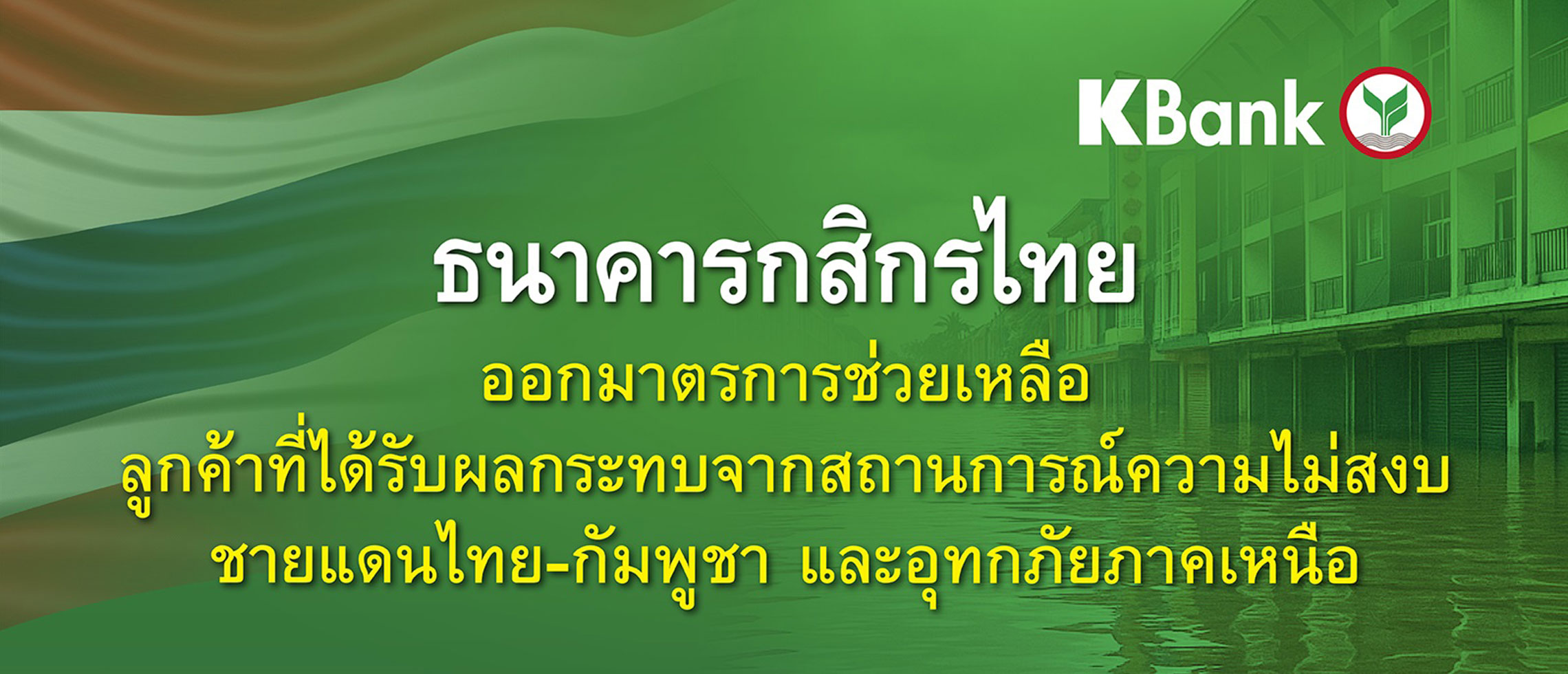 กสิกรไทยออกมาตรการช่วยเหลือลูกค้าที่ได้รับผลกระทบจากสถานการณ์ความไม่สงบชายแดนไทย-กัมพูชา และอุทกภัยในภาคเหนือที่เกิดขึ้นจากอิทธิพลของพายุ “วิภา” ด้วยมาตรการพักชำระเงินต้น ผ่อนเฉพาะดอกเบี้ยนานสูงสุด 3 เดือน วงเงินสินเชื่อที่กู้เพิ่มได้เพื่อซ่อมแซมบ้านและสถานประกอบการ และสินเชื่ออื่น ๆ หวังช่วยบรรเทาความเดือดร้อนและช่วยให้ลูกค้าฟื้นตัวและเดินหน้าต่อได้อย่างรวดเร็ว