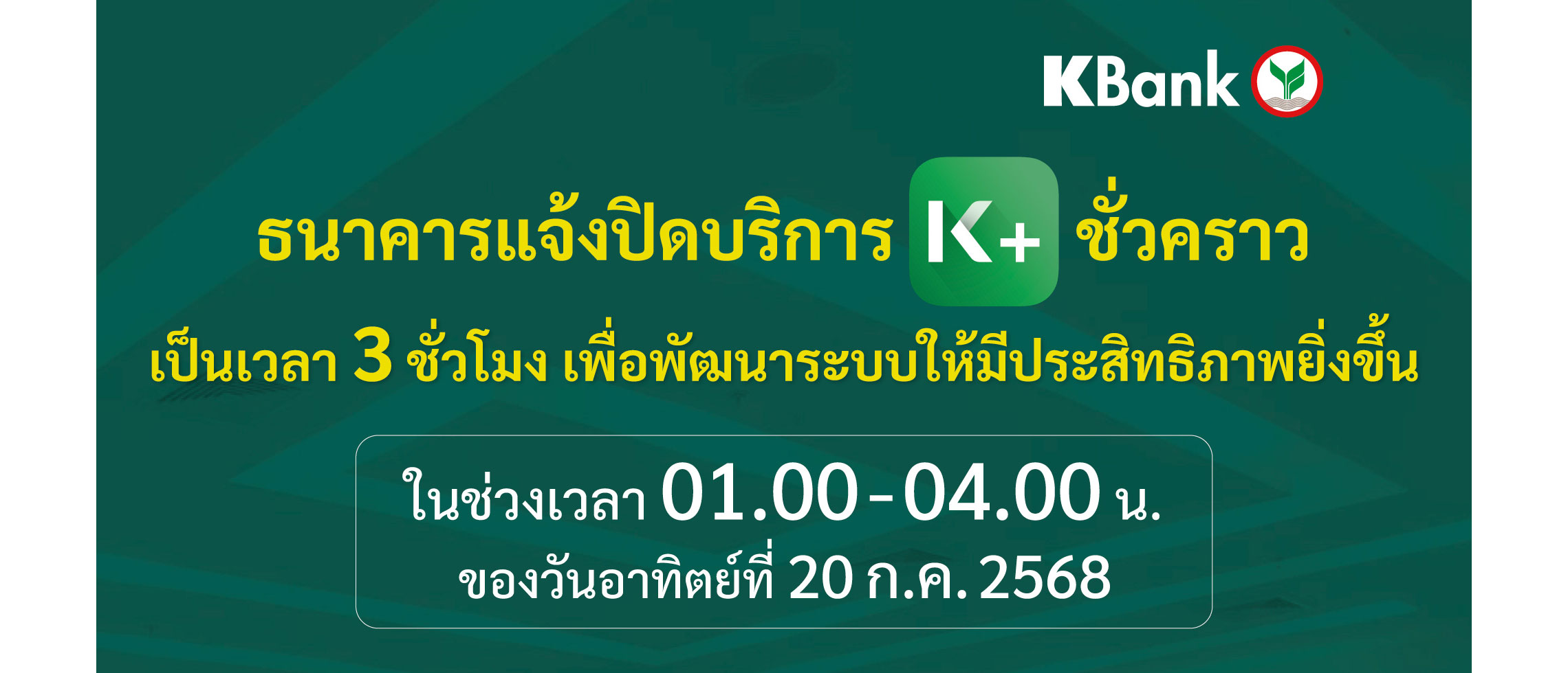 ธนาคารกสิกรไทยแจ้งปิดบริการ K PLUS ชั่วคราว เป็นเวลา 3 ชั่วโมง เพื่อพัฒนาระบบให้มีประสิทธิภาพยิ่งขึ้น ในวันอาทิตย์ที่ 20 กรกฎาคม 2568 เวลา 01.00 – 04.00 น.