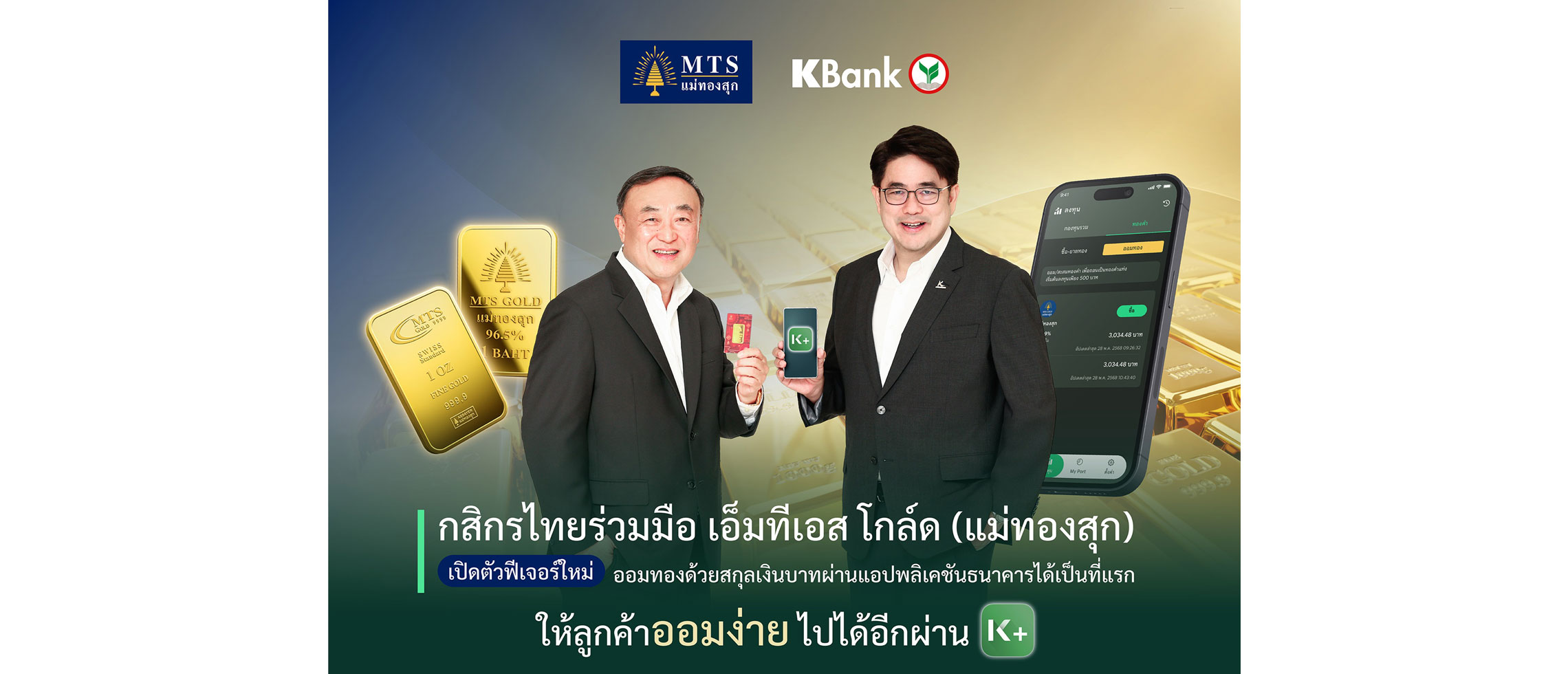 กสิกรไทย ร่วมมือ เอ็มทีเอส โกล์ด (แม่ทองสุก) เปิดตัวฟีเจอร์ใหม่ ออมทองด้วยสกุลเงินบาทผ่านแอปพลิเคชันธนาคารได้เป็นที่แรก ให้ลูกค้าออมง่ายไปได้อีกผ่าน K PLUS