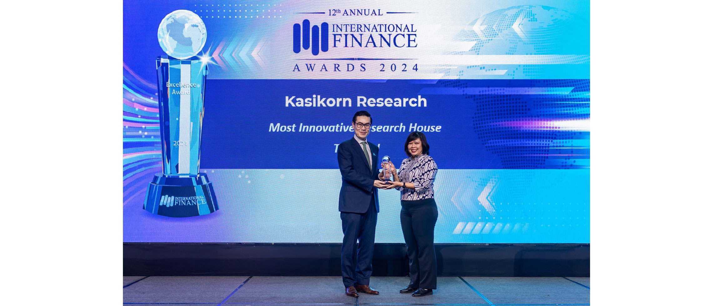 นายบุรินทร์ อดุลวัฒนะ กรรมการผู้จัดการ และ Chief Economist บริษัท ศูนย์วิจัยกสิกรไทย จำกัด เป็นผู้แทนรับรางวัล Most Innovative Research House (รางวัลสถาบันวิจัยที่มีนวัตกรรมยอดเยี่ยม) จากงาน International Finance Awards 2024 สะท้อนถึงความมุ่งมั่นในการพัฒนา นวัตกรรมงานวิจัยและการวิเคราะห์เชิงลึก เพื่อสนับสนุนการตัดสินใจทางธุรกิจและการลงทุนของธนาคาร ภาคธุรกิจ และลูกค้าทุกภาคส่วน จัดโดย International Finance นิตยสารด้านธุรกิจและการเงินชั้นนำระดับโลกจากประเทศอังกฤษ ณ โรงแรมวอลดอร์ฟ แอสโทเรีย กรุงเทพฯ เมื่อเร็ว ๆ นี้