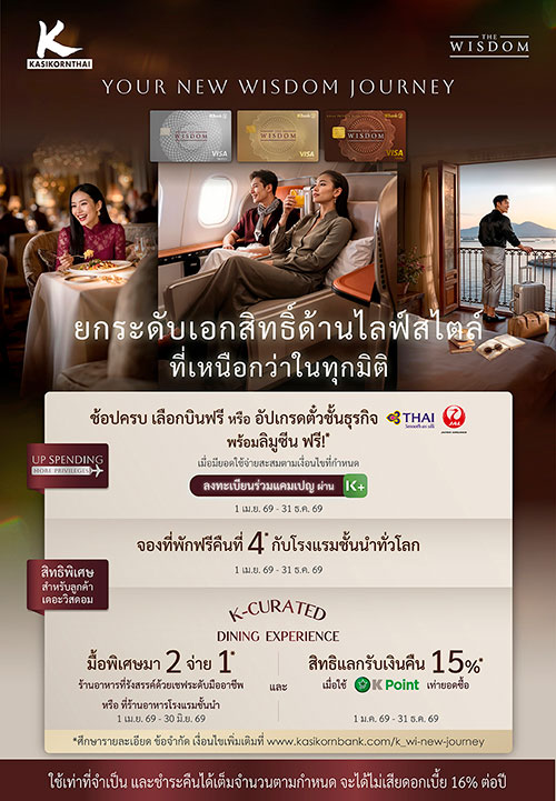 ​        เดอะวิสดอมกสิกรไทย* (KBank THE WISDOM) เดินหน้าสู่ก้าวใหม่ของการยกระดับสิทธิพิเศษด้วยบัตรเครดิตเดอะวิสดอมกสิกรไทย ภายใต้แนวคิด “Your New WISDOM Journey” พร้อมอัปเกรดประสบการณ์ให้ตอบโจทย์ไลฟ์สไตล์ที่หลากหลายและมีความหมายยิ่งขึ้น จับมือกับ วีซ่า (Visa) มอบประสบการณ์เอ็กซ์คลูซีฟ ครอบคลุมทั้งการเดินทาง การพักผ่อน และการใช้ชีวิตระดับลักชูรี ผ่านแคมเปญ “UP SPENDING, MORE PRIVILEGES” ลูกค้าสามารถเปลี่ยนทุกการใช้จ่ายผ่านบัตรเครดิตเดอะวิสดอมกสิกรไทยให้เป็นประสบการณ์เอ็กซ์คลูซีฟ ครอบคลุมทั้งเลือกตั๋วเครื่องบิน หรือเลือกอัปเกรดสู่ชั้นธุรกิจ พร้อมบริการลิมูซีนรับ-ส่ง รวมถึงสิทธิพิเศษด้านการท่องเที่ยวและไลฟ์สไตล์ อาทิ พักฟรีคืนที่ 4 ในโรงแรมระดับเวิลด์คลาสทั่วโลก และประสบการณ์มื้ออาหารเอ็กซ์คลูซีฟกับ K-Curated Dining Experience พร้อมสิทธิพิเศษมา 2 จ่าย 1 และแลก K Point รับเครดิตเงินคืนสูงสุด 15% ระหว่างวันที่ 1 เมษายน 2569 – 31 ธันวาคม 2569