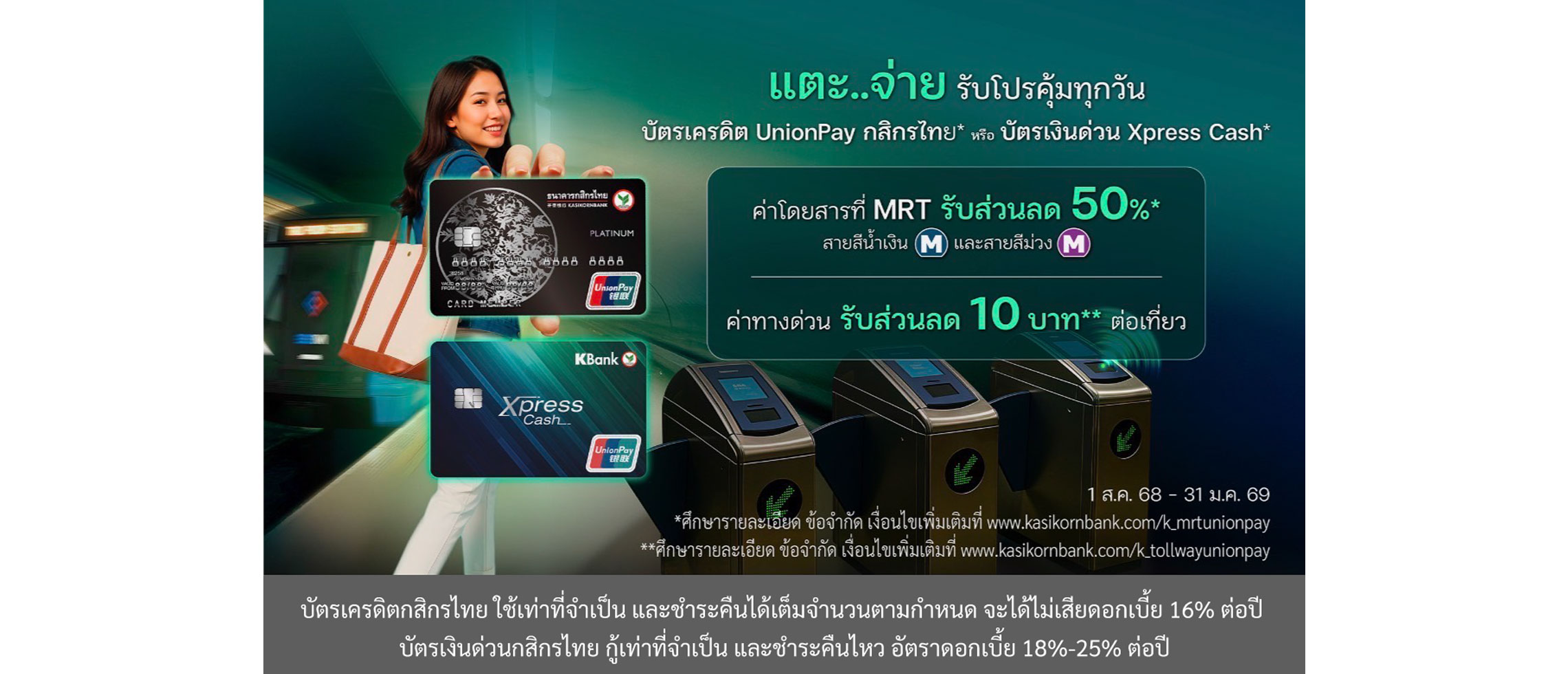 บัตรเครดิต UnionPay กสิกรไทย* และบัตรเงินด่วน Xpress Cash* ช่วยลดค่าใช้จ่ายประจำวันของคนเมืองที่เดินทางด้วยรถไฟฟ้า MRT และขึ้นทางด่วน พร้อมอำนวยความสะดวกในการเดินทางเพียงแค่แตะจ่ายผ่านบัตร รับโปรคุ้มแรงได้ทุกวัน
