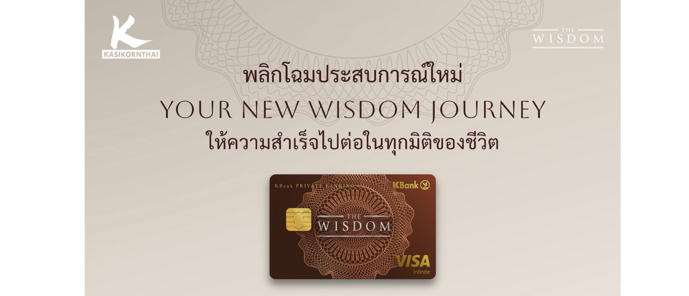ธนาคารกสิกรไทย พลิกโฉม “เดอะวิสดอม (THE WISDOM)” สู่ประสบการณ์ใหม่สำหรับลูกค้ากลุ่มเวลธ์ ยกระดับสู่การเป็นพาร์ตเนอร์ระยะยาวที่เติบโตไปกับความสำเร็จของลูกค้า ในคอนเซปต์ “Your New WISDOM Journey ให้ความสำเร็จไปต่อในทุกมิติของชีวิต” เปิดตัวบัตรใหม่ที่มีดีไซน์เฉพาะตัวตามระดับ สินทรัพย์ สะท้อนเอกลักษณ์ความมั่งคั่งที่เรียบหรูและมีพลัง พร้อมสิทธิพิเศษที่ออกแบบมาเพื่อตอบโจทย์ เฉพาะบุคคลอย่างลึกซึ้ง