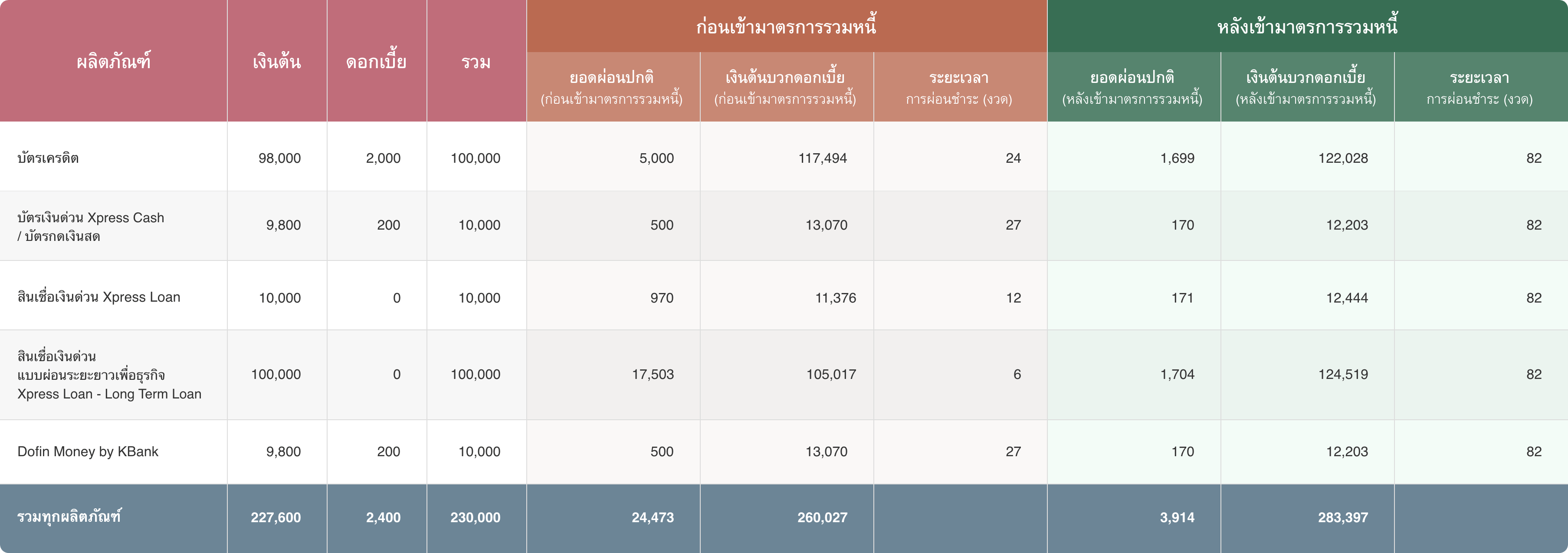 - หลังจากปรับปรุงโครงสร้างหนี้โดยการรวมหนี้แล้ว กรณีมีรายการใช้จ่ายที่เรียกเก็บมายังบัตรของท่านภายหลัง ลูกค้ายังต้องชำระค่าใช้จ่ายดังกล่าวในบัตรเดิม