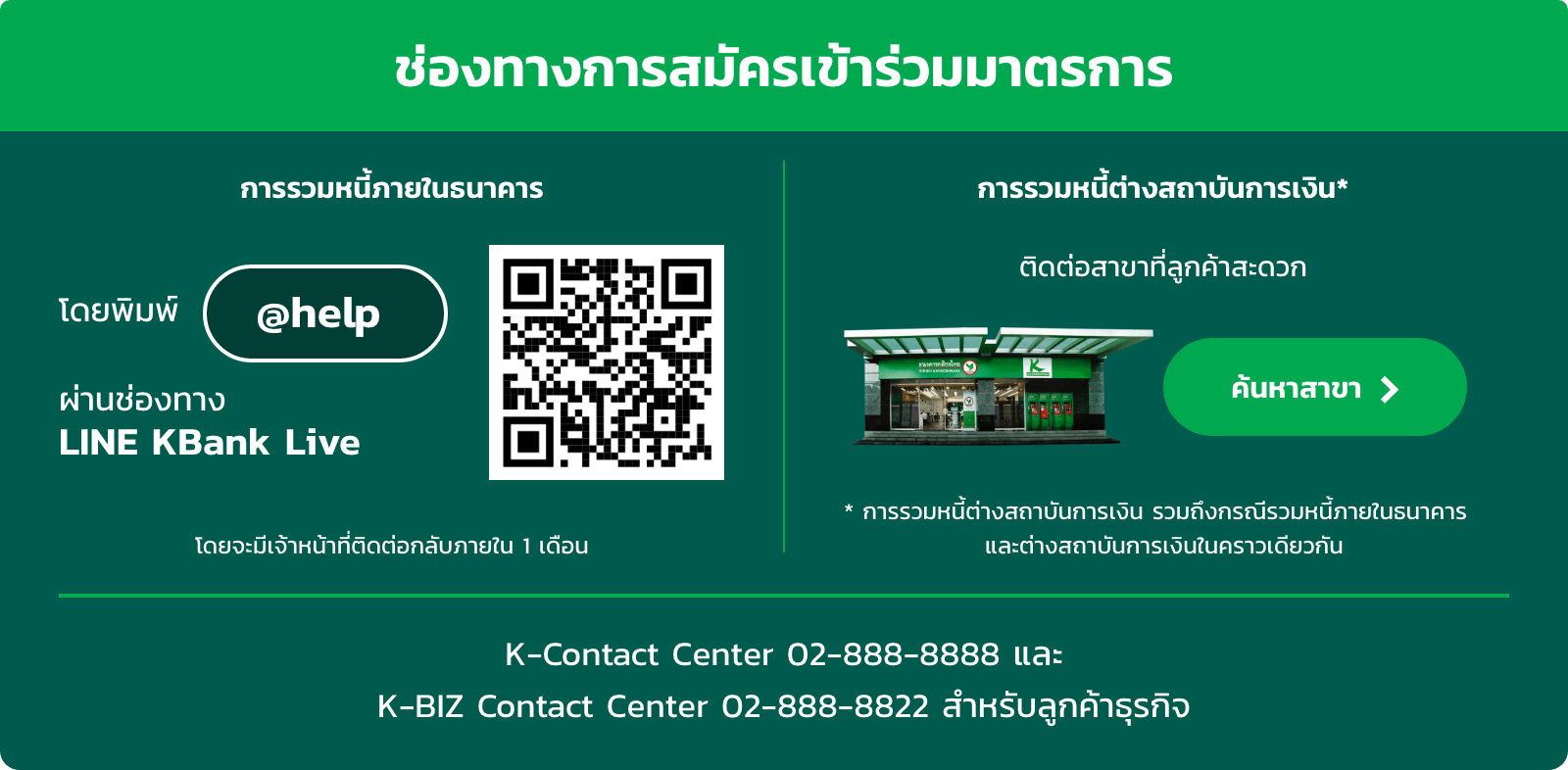 - ผู้ลงทะเบียนเพื่อขอเข้าร่วมมาตรการต้องเป็นบัตรหลักเท่านั้น โดยในการรวมหนี้ ธนาคารจะรวมภาระหนี้ของทั้งบัตรหลักและบัตรเสริมโดยไม่เกินวงเงินถาวรของบัตรหลัก