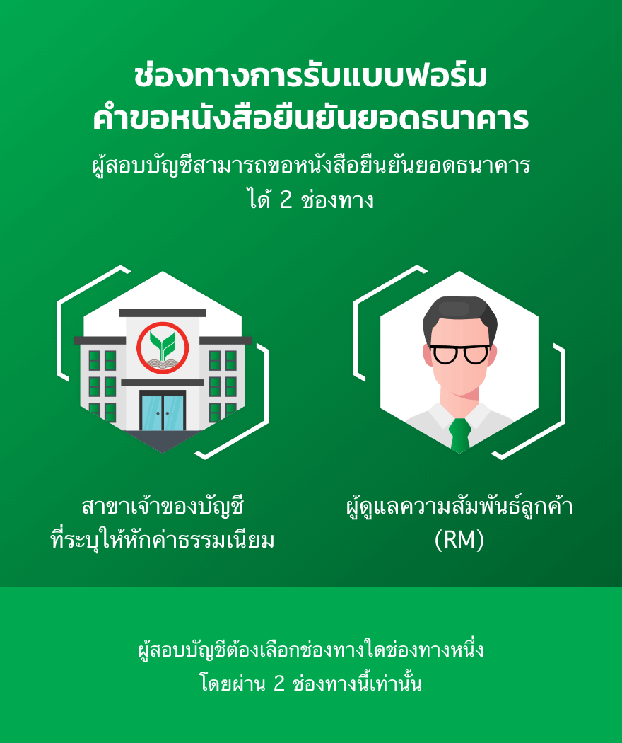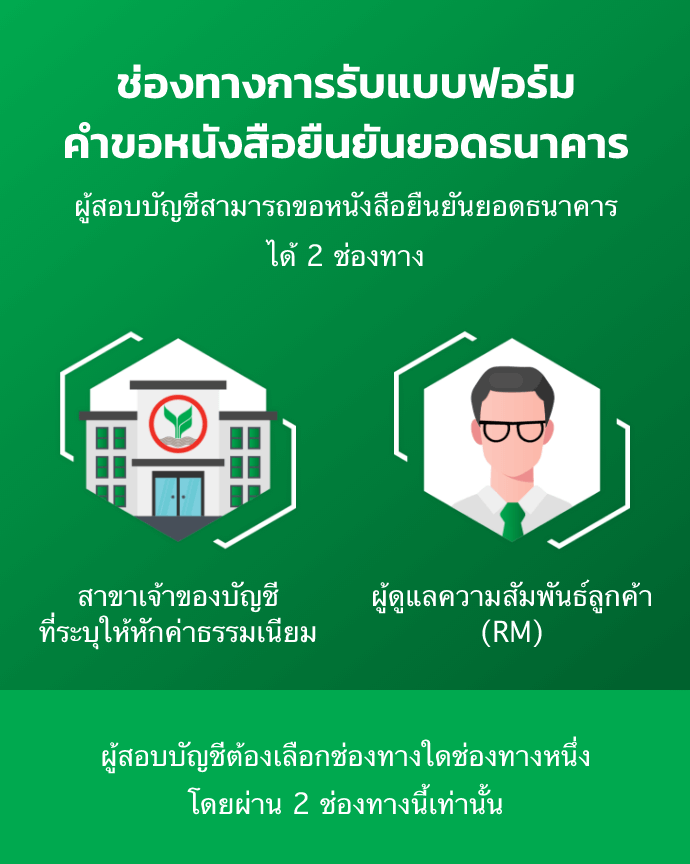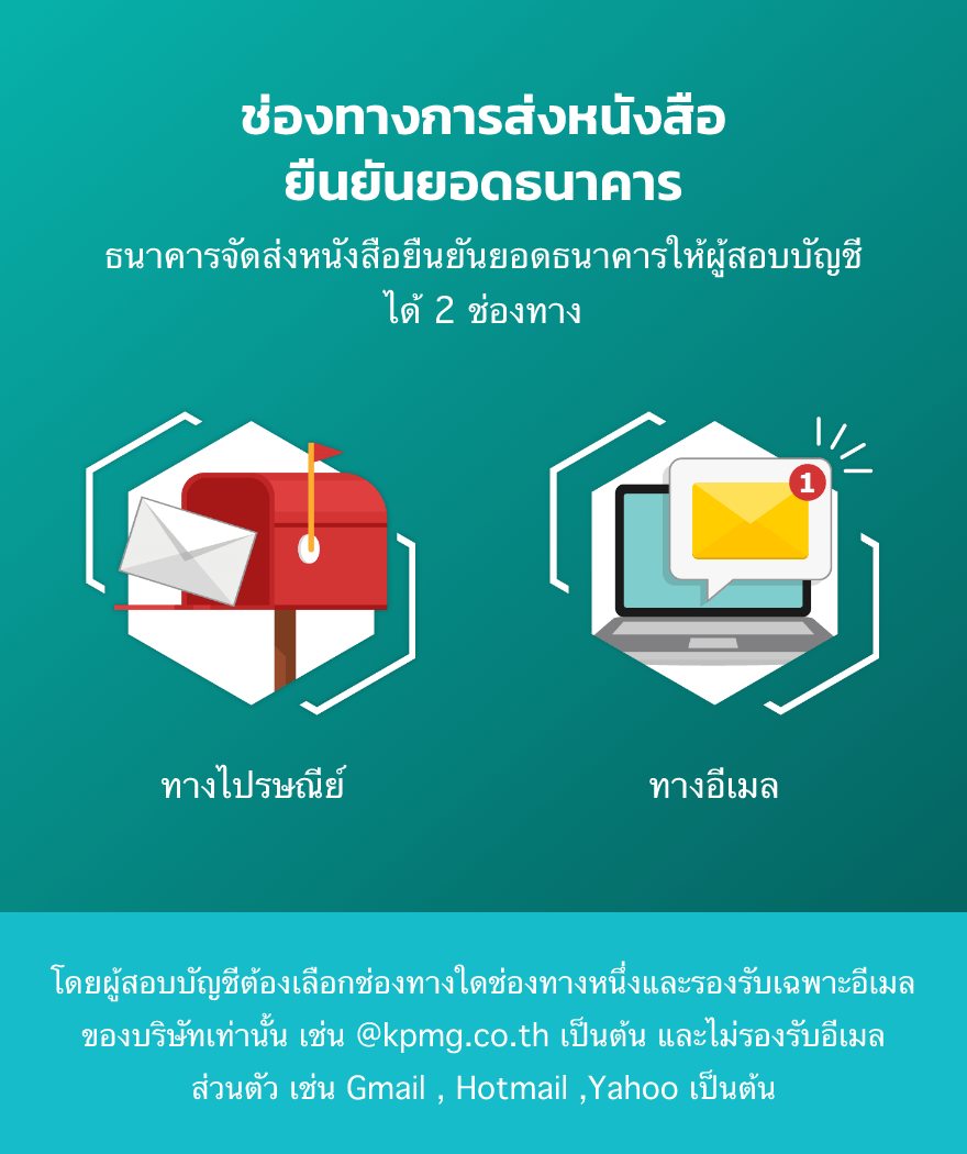 เป็นการออกหนังสือยืนยันยอดธนาคารให้กับผู้สอบบัญชี เพื่อเป็นข้อมูลในการตรวจสอบฐานะทางการเงินของนิติบุคคลที่มีอยู่กับธนาคาร ทั้งทรัพย์สิน หนี้สิน และภาระผูกพัน โดยครอบคลุมทุกบัญชีและทุกผลิตภัณฑ์ ตามมาตรฐานที่ทางสมาคมธนาคารไทย และสภาวิชาชีพบัญชีในพระบรมราชูปถัมภ์กำหนด
