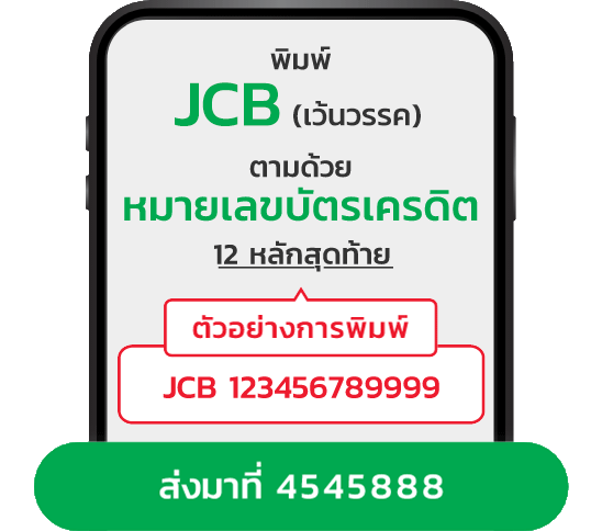 - ผู้ถือบัตรเครดิตเจซีบีกสิกรไทยที่มีสิทธิรับคะแนนสะสม K Point พิเศษต้องลงทะเบียนเข้าร่วมรายการ โดยสามารถลงทะเบียนผ่าน SMS พิมพ์ JCB เว้นวรรค ตามด้วยหมายเลขบัตรเครดิต 12 หลักสุดท้าย ส่งมาที่ 4545888 (ค่าบริการครั้งละ 3 บาท) และได้รับข้อความตอบกลับ ระหว่างวันที่ 1 เม.ย. 66 - 31 ก.ค. 66 เท่านั้น