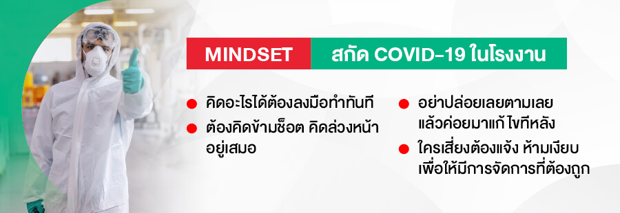 ตั้งแต่ช่วงแรกจนถึงปัจจุบัน สิ่งที่โรงงานนี้เน้นย้ำมาตลอดคือ พนักงานทุกคนต้องสวมหน้ากากอนามัย หากไม่เชื่อฟังจะถูกพักงานหรือออกใบแจ้งเตือน ล้างมือให้สะอาด วัดอุณหภูมิ รวมถึงการใช้แอลกอฮอล์เช็ดทำความสะอาดตามลูกบิดและสิ่งที่คนใช้ร่วมกัน