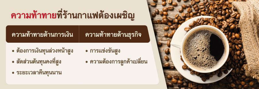 ถึงแม้ว่าธุรกิจร้านกาแฟจะมีแนวโน้มขยายตัวจากปริมาณการบริโภคที่สูงขึ้น รวมถึงการเพิ่มจำนวนของร้านกาแฟทั้งประเภทแฟรนไชส์และนอนแฟรนไชส์ อย่างไรก็ตามธุรกิจร้านกาแฟยังคงมีความท้าทายที่สำคัญบางประการ