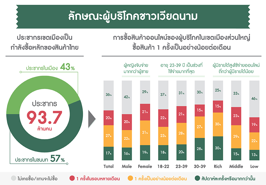 ธุรกิจการค้าผ่านช่องทางออนไลน์ของเวียดนามเติบโตด้วยหลายปัจจัยผลักดัน ไม่ว่าจะเป็นการพัฒนาโครงสร้างพื้นฐานตั้งแต่เวียดนามเริ่มเข้าถึงอินเทอร์เน็ตในปี 2540 จนกระทั่งปัจจุบันมีจำนวนประชากรเข้าถึงอินเทอร์เน็ตสูงถึง 64 ล้านคน คิดเป็นสัดส่วนถึงร้อยละ 68.3 ของประชากรทั้งประเทศที่มี 93.7 ล้านคน ขณะเดียวกันปัจจัยด้านรายได้ที่เพิ่มขึ้นตามความร้อนแรงทางเศรษฐกิจก็ผลักดันให้ชาวเวียดนามสามารถครอบครองโทรศัพท์เคลื่อนที่จนมีสัดส่วนถึงร้อยละ 74.7 ต่อจำนวนประชากร ในปี 2561 นอกจากนี้ เวียดนามยังเป็นตลาดที่มีประชากรอยู่ในวัยหนุ่มสาวถึงเกือบร้อยละ 50 เป็นกลุ่มคนที่เกิดในยุคมิลเลนเนียม (เกิดในปี 2524-2539) และกลุ่ม Generation Z (เกิดในปี 2540-2553) ซึ่งคุ้นเคยกับเทคโนโลยีสมัยใหม่เป็นอย่างดี จะเห็นได้ว่ากระแสธุรกิจค้าผ่านออนไลน์ในเวียดนามมีสัญญาณเติบโตอย่างน่าสนใจ อีกทั้งลักษณะการบริโภคผ่านช่องทางออนไลน์ก็คล้ายคลึงกับประเทศไทย ซึ่งมีกลุ่มประชากรผู้หญิงเป็นกำลังซื้อหลักและสินค้าไลฟ์สไตล์น่าจะเป็นที่ต้องการ จึงเป็นโอกาสของธุรกิจ SME ไทยให้สามารถส่งสินค้าไปจำหน่ายตอบโจทย์การบริโภคในเวียดนามโดยเฉพาะประชากรในเขตเมือง ชนชั้นกลางขึ้นไป ที่มีกำลังซื้อสินค้าจากต่างประเทศและเข้าถึงช่องทางการซื้อสินค้าผ่าน E-commerce โดยสินค้าไทยที่มีโอกาส อาทิ อาหารไทย อาหารสำเร็จรูป เครื่องสำอางออร์แกนิค และของแต่งบ้าน
