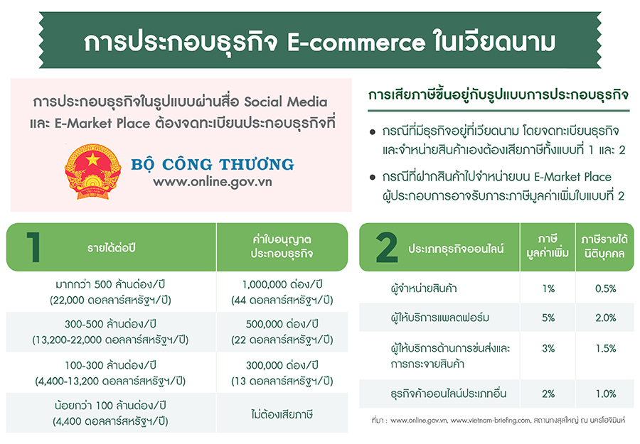 การค้าผ่าน E-commerce จะต้องจดทะเบียนประกอบธุรกิจอย่างถูกต้องที่ www.online.gov.vn เพื่อให้ได้ใบอนุญาตประกอบธุรกิจค้าออนไลน์ โดยธุรกิจที่มีรายได้ต่ำกว่า 4,400 ดอลลาร์สหรัฐฯ/ปี ไม่ต้องเสียภาษี นอกจากนี้ ธุรกิจยังต้องเสียภาษีมูลค่าเพิ่มร้อยละ 1-5 และภาษีเงินได้นิติบุคคลร้อยละ 0.5-2.0 ซึ่งขึ้นอยู่กับประเภทธุรกิจที่จดทะเบียน อย่างไรก็ดี ความท้าทายของผู้ประกอบการไทยมี 2 ประเด็นหลัก คือ ด้านการชำระเงินผู้บริโภคชาวเวียดนามยังขาดความเชื่อมั่นในการชำระค่าสินค้าด้วยรูปแบบออนไลน์ ทำให้ส่วนใหญ่ราวร้อยละ 80 ยังเป็นการชำระเงินสดที่ปลายทาง (COD) ตามมาด้วยการโอนเงินผ่านระบบธนาคาร บัตรเครดิต กระเป๋าเงินอิเล็กทรอนิกส์ (E-wallets) และด้านการขนส่งในประเทศยังค่อนข้างล่าช้า หากการขนส่งสินค้าแบบปกติทางไปรษณีย์ อาทิ การขนส่งทางรถระหว่างฮานอยกับโฮจิมินห์ใช้เวลานานถึง 3 วัน ทั้งนี้ สำหรับ SME ไทยที่สนใจทำธุรกิจ E-commerce ในเบื้องต้นสามารถติดต่อกรมส่งเสริมการค้าระหว่างประเทศ กระทรวงพาณิชย์ (www.ditp.go.th) ซึ่งมีเครือข่ายตั้งอยู่ทั้งในฮานอยและโฮจิมินห์ที่สามารถช่วยเหลือผู้ประกอบการในการทำธุรกิจที่เวียดนามได้