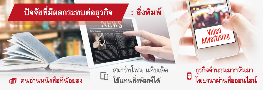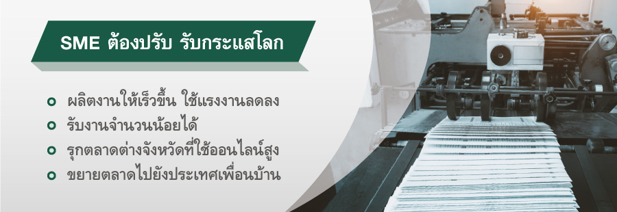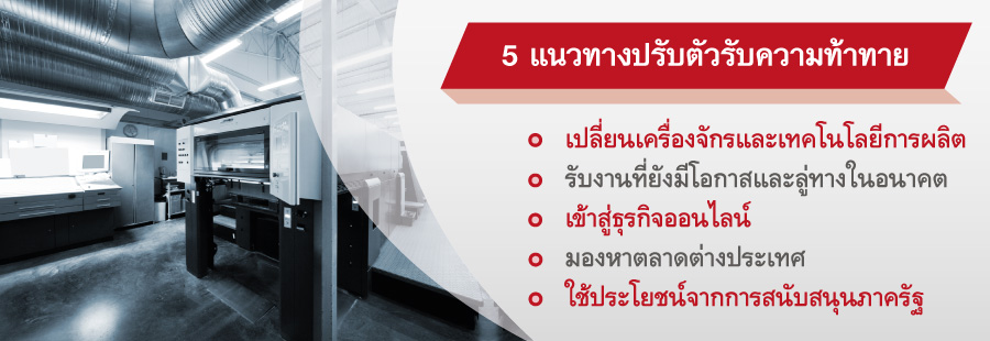 จากสภาพแวดล้อมทางธุรกิจที่เปลี่ยนแปลงอย่างรวดเร็ว โดยเฉพาะการให้ตอบรับสื่อดิจิทัล อาทิ สื่ออิเล็กทรอนิกส์ เช่น E-Book, E-Magazine และเว็บไซต์หนังสือพิมพ์ เป็นต้น ที่เข้ามาแทนที่สื่อดั้งเดิมของผู้บริโภคในปัจจุบัน ส่งผลให้ธุรกิจ SME บางส่วนที่สายป่านสั้นจำเป็นต้องปิดกิจการไป หรือบางรายก็มีการควบรวมกิจการเพื่อเพิ่มอำนาจต่อรองทางด้านการสั่งซื้อวัตถุดิบ หรือการบริหารต้นทุนพนักงานให้ลดลง รวมทั้งบางรายมีการปรับรูปแบบการดำเนินธุรกิจด้วยการขยายไปทำธุรกิจผ่านช่องทางออนไลน์ที่กำลังเติบโตแทน