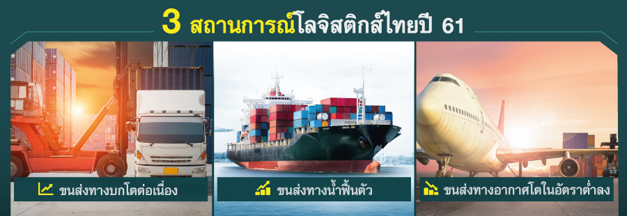 ธุรกิจโลจิสติกส์ตลอดปี 61 คาดว่าจะเติบโตที่ร้อยละ 8 จากภาพรวมเศรษฐกิจของประเทศที่คาดว่าจะขยายตัวร้อยละ 4.0-5.0 ต่อเนื่องจากที่เติบโตร้อยละ 3.9 ในปี 60 ทั้งนี้ การส่งออกไทยที่มีการขยายตัวในช่วง 5 เดือนแรกของปี 61 จากเศรษฐกิจคู่ค้าสำคัญของไทยที่ฟื้นตัว รวมถึงการดำเนินโครงการก่อสร้างโครงสร้างพื้นฐาน ส่งผลให้ภาคการขนส่งไทยที่เป็นอุปสงค์สืบเนื่องเพิ่มสูงขึ้นรองรับกิจกรรมในระบบเศรษฐกิจที่อยู่ในทิศทางที่ดี รวมถึงภาคการท่องเที่ยวที่มีบทบาทต่ออุตสาหกรรมขนส่งก็มีสถานการณ์ที่ดีอย่างต่อเนื่องเช่นเดียวกัน