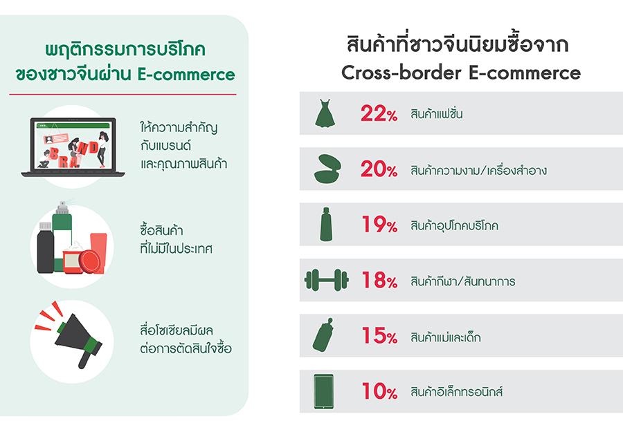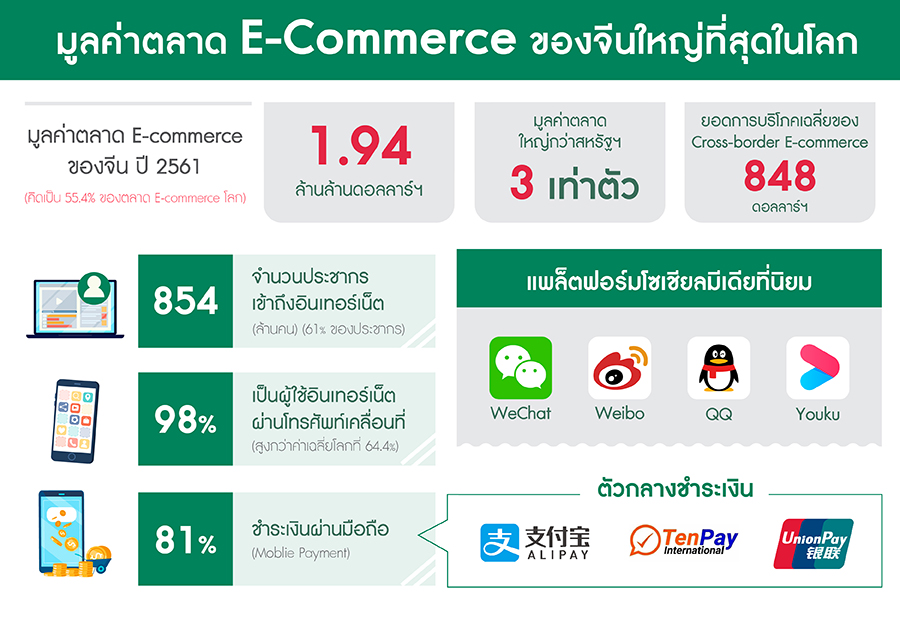 การบริโภคในจีนเข้าสู่กระแสออนไลน์ชัดเจน จะเห็นได้จากจำนวนผู้ใช้อินเทอร์เน็ตที่เพิ่มขึ้นอย่างรวดเร็วแตะ 854 ล้านคน (ข้อมูล ณ เดือน มิ.ย. 2562) คิดเป็นร้อยละ 61.2 ของประชากรจีน และในจำนวนดังกล่าว เป็นการใช้งานผ่านโทรศัพท์เคลื่อนที่ถึงกว่าร้อยละ 98 ความสะดวกดังกล่าวทำให้ช่องทางการซื้อขายออนไลน์ หรือ E-Commerce กลายเป็นช่องทางจับจ่ายที่สำคัญของผู้บริโภคชาวจีน ซึ่งการเจาะตลาดผ่านช่องทางนี้น่าจะช่วยเพิ่มโอกาสในการขยายตลาดให้กับผู้ประกอบการ SME ได้