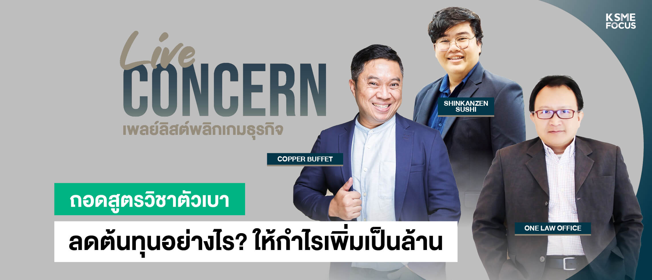 Live Concern : เพลย์ลิสต์ พลิกเกมธุรกิจ ที่ธนาคารกสิกรไทยจัดขึ้น โดยมี เกษมสันต์ สัตยารักษ์ ผู้จัดการทั่วไป Copper Buffet และชนวีร์ หอมเตย ผู้ร่วมก่อตั้ง Shinkanzen Sushi พร้อมด้วย ชินภัทร วิสุทธิแพทย์ ที่ปรึกษาด้านกฎหมายและภาษี ONE Law Office