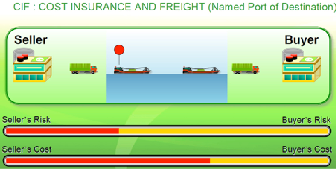 3. CIF (Cost, Insurance & Freight) คือ เงื่อนไขการส่งมอบสินค้าที่ผู้ขายจะสิ้นสุดภาระการส่งมอบเมื่อสินค้าวางบนเรือที่ท่าเรือต้นทาง (on board the vessel) และผู้ขายเป็นผู้รับผิดชอบค่าใช้จ่ายพิธีการส่งออก รวมทั้งทำสัญญาการขนส่ง จ่ายค่าขนส่งสินค้าจากท่าเรือต้นทางไปยังท่าเรือปลายทาง (ค่าระวางเรือ) และค่าประกันภัยขนส่งสินค้า หรือก็คือ FOB + ค่าระวางเรือ + ค่าประกันภัยขนส่งสินค้า เพื่อคุ้มครองสินค้าระหว่างเดินทางไปจนกว่าจะถึงมือผู้ซื้อ