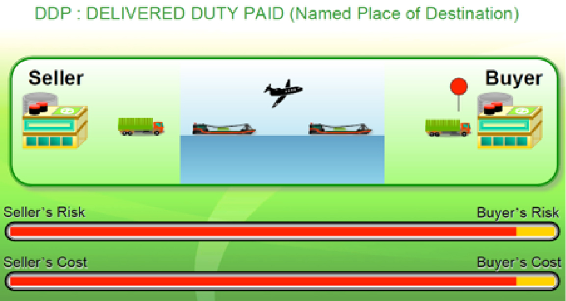 4. DDP (Delivered Duty Paid หรือ Door to Door) คือ เงื่อนไขการส่งมอบสินค้าที่ผู้ขายจะสิ้นสุดภาระการส่งมอบ ณ สถานที่ของผู้ซื้อ (buyer’s warehouse) นั่นหมายความว่า ผู้ขายต้องรับผิดชอบค่าใช้จ่ายในการขนส่งสินค้าจากสถานที่ของผู้ขายไปยังสถานที่ของผู้ซื้อ รวมถึงพิธีการทั้งขาออก-ขาเข้า และภาษีนำเข้าด้วย นอกจากนั้นผู้ขายยังต้องรับความเสี่ยงต่อความเสียหายของสินค้าที่อาจเกิดขึ้นระหว่างการขนส่ง ดังนั้นแนะนำให้ผู้ขายทำประกันภัยสินค้าจาก seller’s warehouse to buyer’s warehouse