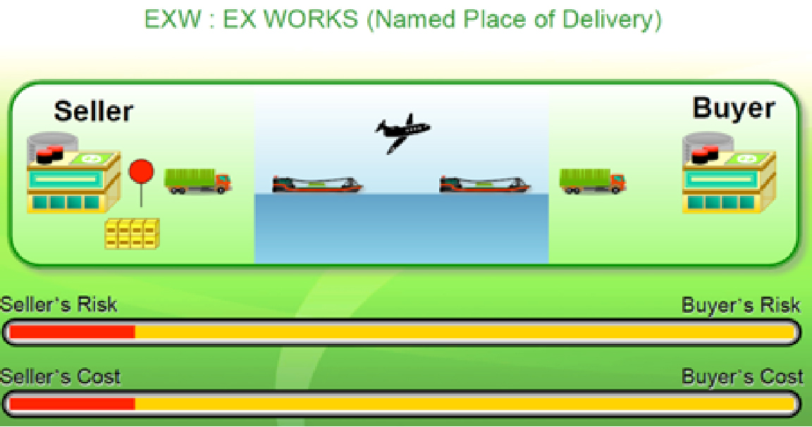 1. EXW (Ex Works) คือ เงื่อนไขการส่งมอบสินค้าที่ผู้ขายจะสิ้นสุดภาระการส่งมอบสินค้า ณ สถานที่ของผู้ขาย ผู้ซื้อจะเป็นผู้รับความรับผิดชอบค่าใช้จ่ายในการขนส่งสินค้าจากสถานที่ของผู้ขายไปยังประเทศของผู้ซื้อ รวมทั้งทำศุลกากรส่งออก ศุลการกรและภาษีนำเข้าที่เหลือทั้งหมดเอง ซึ่งเงื่อนไขการส่งสินค้าแบบนี้ผู้ขายไม่ต้องจัดการเรื่องการขนส่งและไม่ต้องรับความเสี่ยงต่อความเสียหายของสินค้าระหว่างการขนส่งเลย
