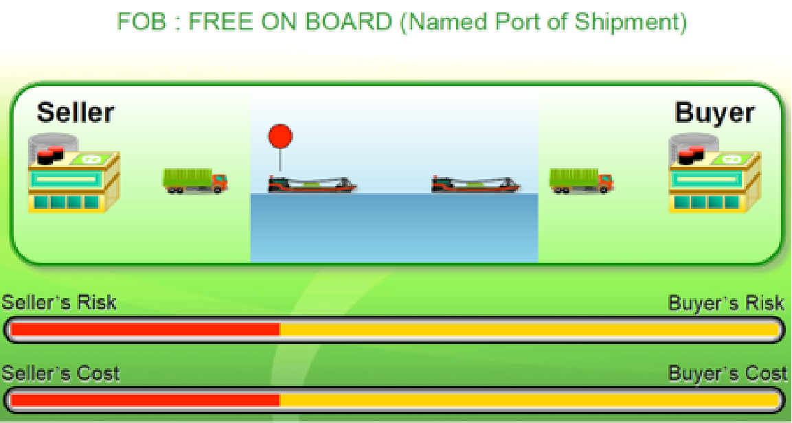 2. FOB (Free On Board) คือ เงื่อนไขการส่งมอบสินค้าที่ผู้ขายจะสิ้นสุดภาระการส่งมอบเมื่อสินค้าวางบนเรือที่ท่าเรือต้นทาง (on board the vessel) และผู้ขายต้องเป็นผู้รับผิดชอบค่าใช้จ่ายพิธีการส่งออกด้วย ส่วนผู้ซื้อจะเป็นผู้รับภาระในการทำสัญญาการขนส่งและจ่ายค่าใช้จ่ายในการขนส่งสินค้าจากท่าเรือต้นทางไปยังท่าเรือปลายทาง (ค่าระวางเรือ) รวมถึงรับความเสี่ยงต่อความเสียหายของสินค้าจากจุดส่งมอบ (ท่าเรือต้นทาง) ซึ่งผู้ซื้อควรทำประกันภัยในการขนส่ง