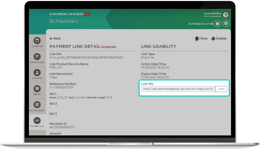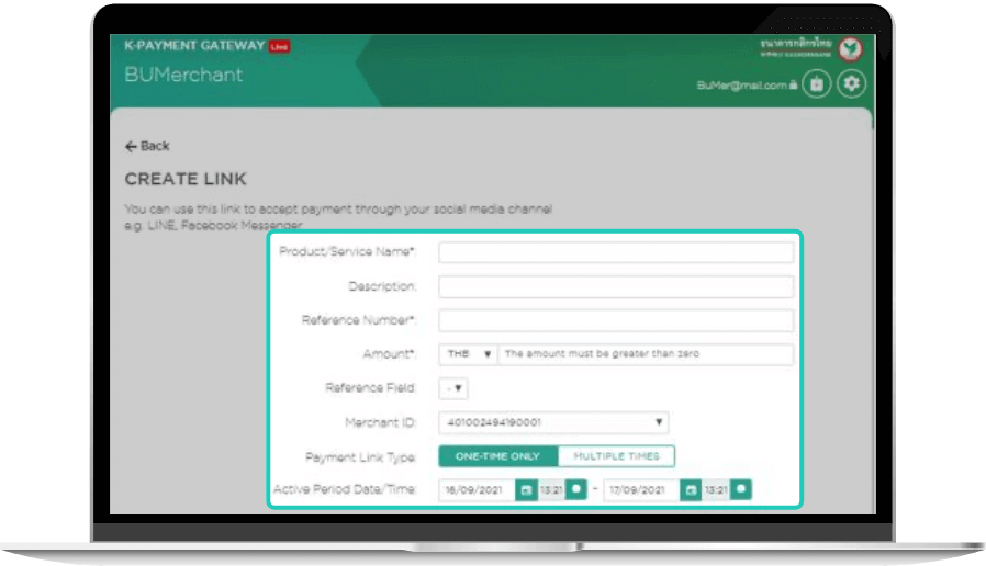 • กำหนดรายละเอียดการชำระเงิน ได้ทั้งจำนวนเงินรับชำระ, กำหนดวันเริ่มต้นและวันสิ้นสุดการใช้งานลิงค์ชำระเงิน เป็นต้น