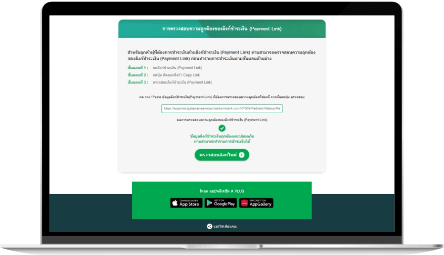 • ร้านค้าสามารถสร้างลิงก์ชำระเงินได้เองผ่าน K Payment Gateway Merchant Portal หรือเชื่อมต่อระบบผ่าน API