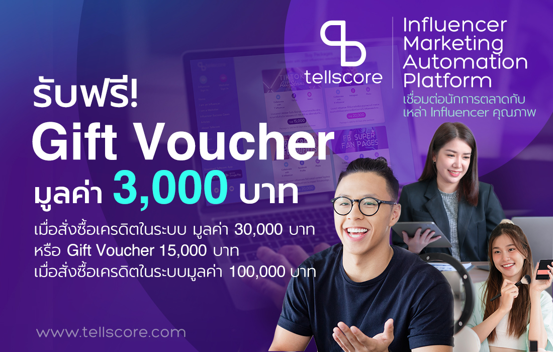 เพื่อใช้จ้างงาน Influencer ในระบบ Tellscore เมื่อซื้อเครดิต ในระบบ 30,000 บาท (Easy plan) หรือ Gift voucher 15,000 บาท เมื่อซื้อเครดิตในระบบ 100,000 บาท (Happy plan)