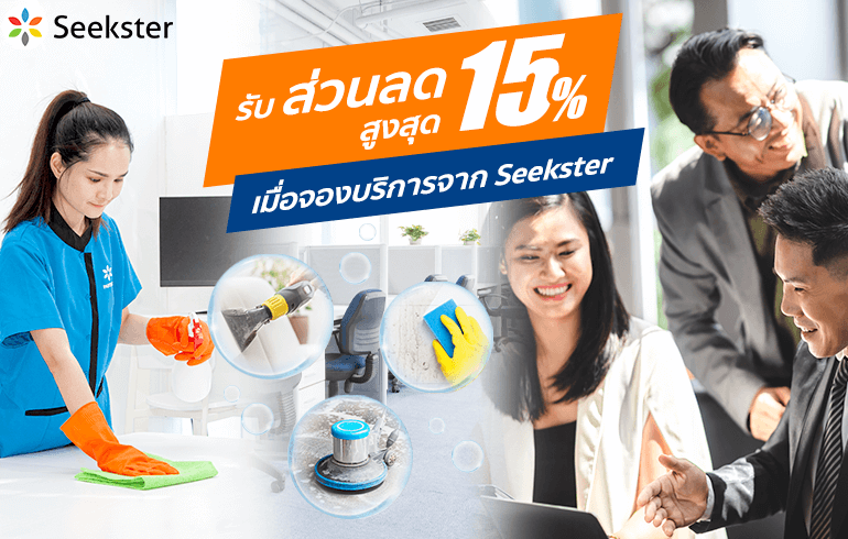 เมื่อจองบริการทำความสะอาดสำนักงาน และ ส่วนลดพิเศษ 8% เมื่อจองบริการใดก็ได้ในแอปพลิเคชั่น Seekster